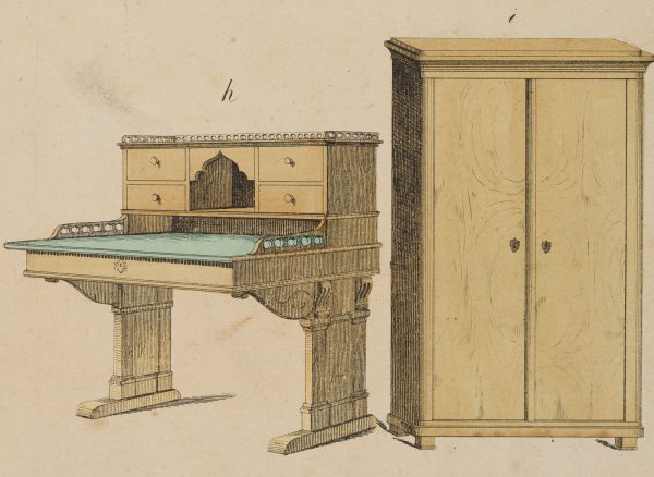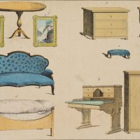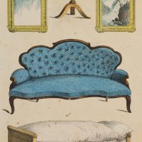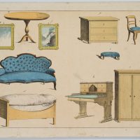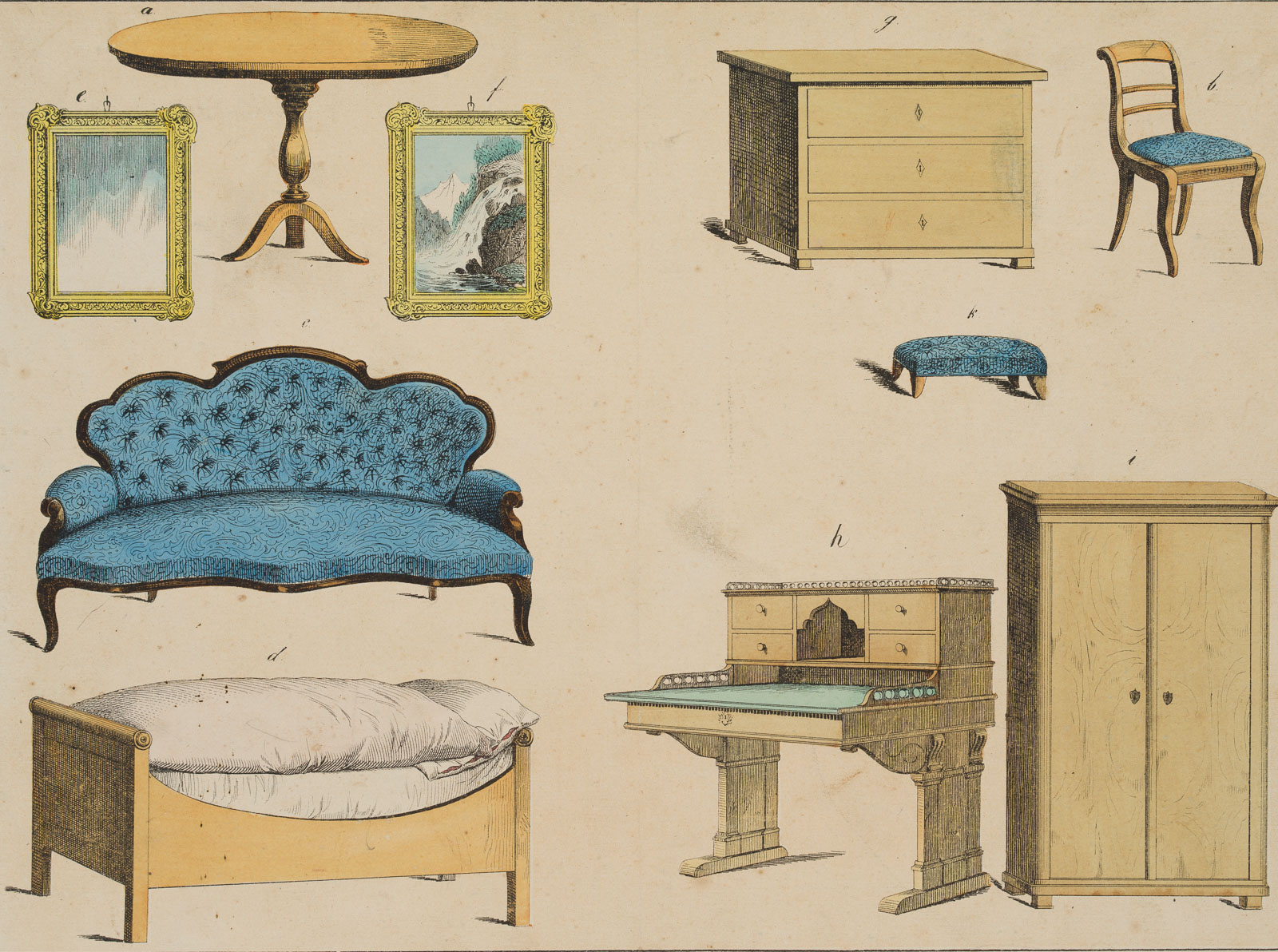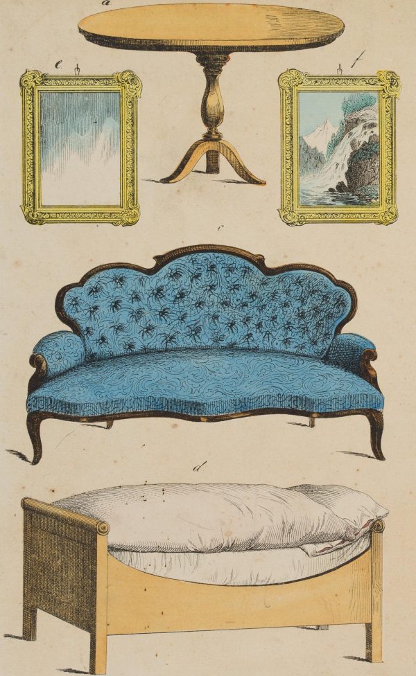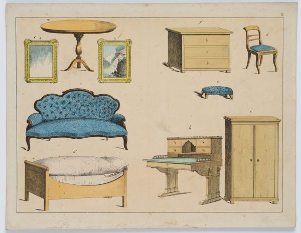 Unbekannt (19. Jahrhundert), Bürgerliche Einrichtungsgegenstände. Möbel: Runder Tisch, Goldrahmenspiegel, Bett, Canapée, Kommode, Sekretär, usw. Anschauungsblätter einer Enzyklopädie, um 1900, Federlithographie