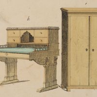 Unknown (19th century), Bourgeois furnishings Furniture: Round table, gold-framed mirror, bed, canapée, chest of drawers, secretary, etc Illustrative sheets of an encyclopaedia, c. 1900, Lithography with pen