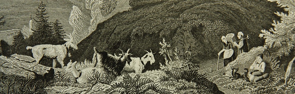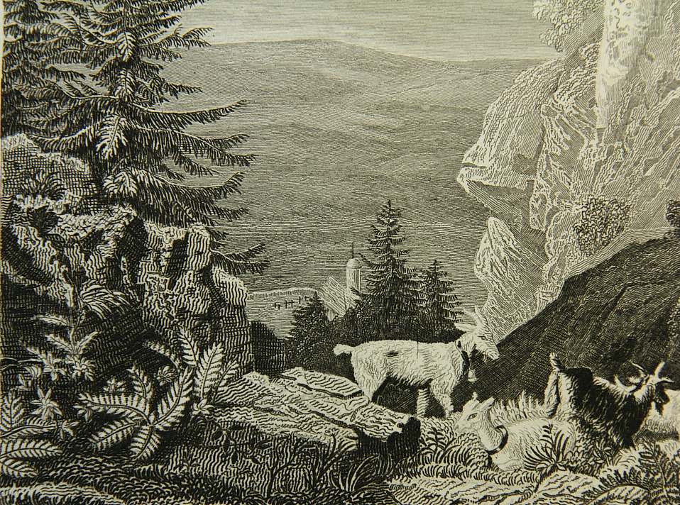 - Beschreibung: Im Vordergrund befindet sich ein Ziegenhirte samt Herde, sowie zwei Reisende.