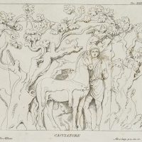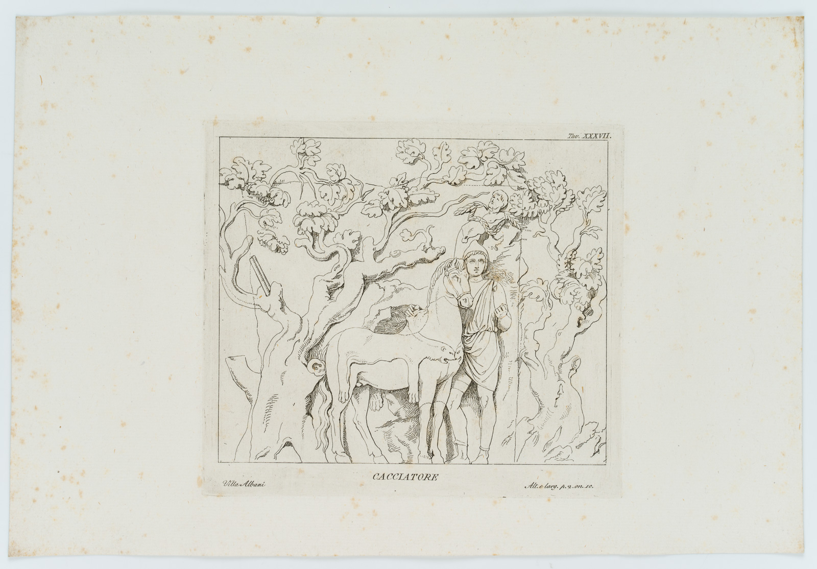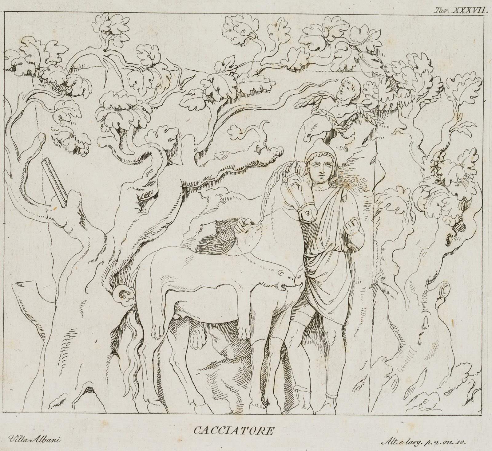 - Inscription: Inscribed below the image in the printing plate with “Cacciatore”, “Villa Albani” and “Alt. e larg. p.2. on. 10”; numbered above with: “Tav. XXXVII.”.