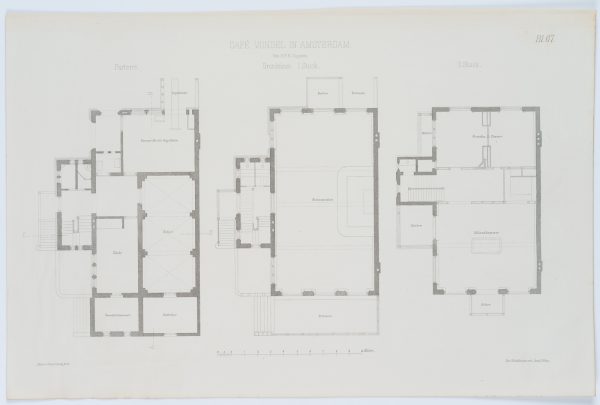 Unknown (19th century), “Café Vondel in Amsterdam”, floor plans ground floor, 1st floor, 2nd floor, Allgem Bauzeitung, 1878, Lithography