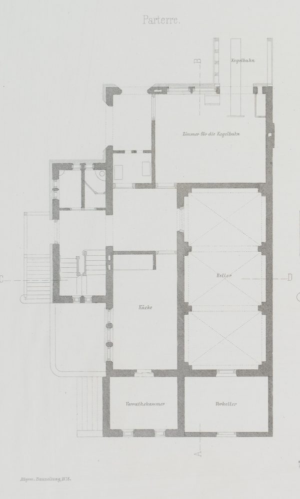 - Beschreibung: Aus: Allgem. Bauzeitung, 1878 (links unten bezeichnet); oben rechts oben nummeriert “Bl. 67”. Die «Allgemeine Bauzeitung» erschien von 1836 – 1918 (jährlich 6 Doppelhefte) und informierte vor allem über alle wichtigen Bauunternehmungen der Monarchie.