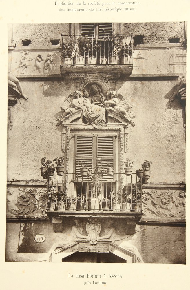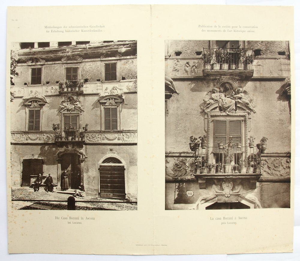 • Description: General view and detail of the ornate stucco decoration on a balcony opening of the Casa Borrani, today also called Casa Serodine. The depiction of the palazzo in Ascona comes from the series of “Mittheilungen der schweizerischen Gesellschaft für Erhaltung historischer Kunstdenkmäler”. Above and below the illustration, there is a German and Italian language designation on each picture.