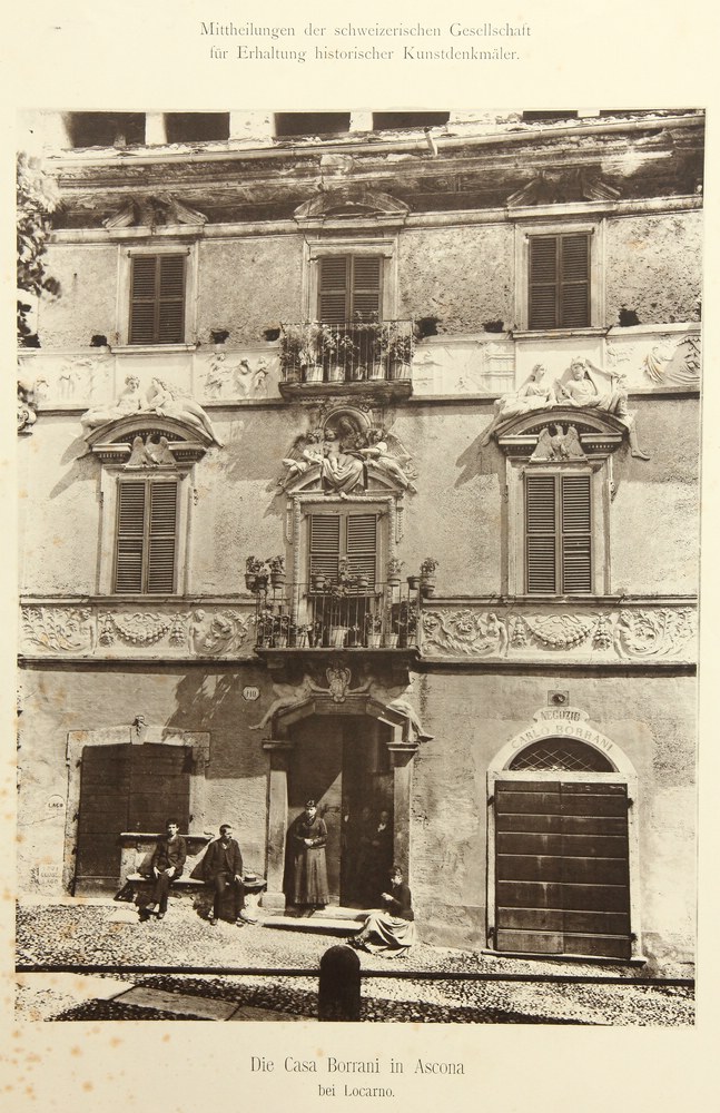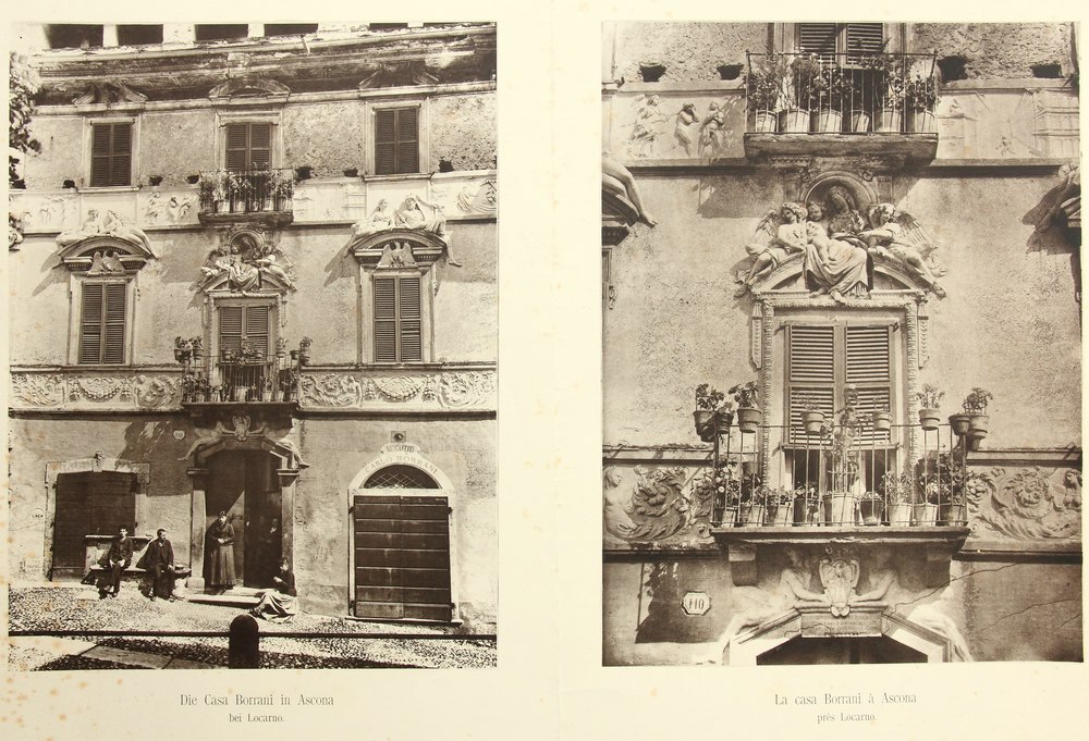 • Beschreibung: Gesamtansicht und Detailausschnitt der kunstvollen Stuckverzierung an einer Balkonöffnung der Casa Borrani, heute auch Casa Serodine genannt. Die Darstellung des Palazzo in Ascona stammt aus der Reihe der Mittheilungen der schweizerischen Gesellschaft für Erhaltung historischer Kunstdenkmäler”. Oberhalb und unterhalb der Darstellung befindet sich an jedem Bild eine deutsch- bzw. italienischsprachige Bezeichnung.