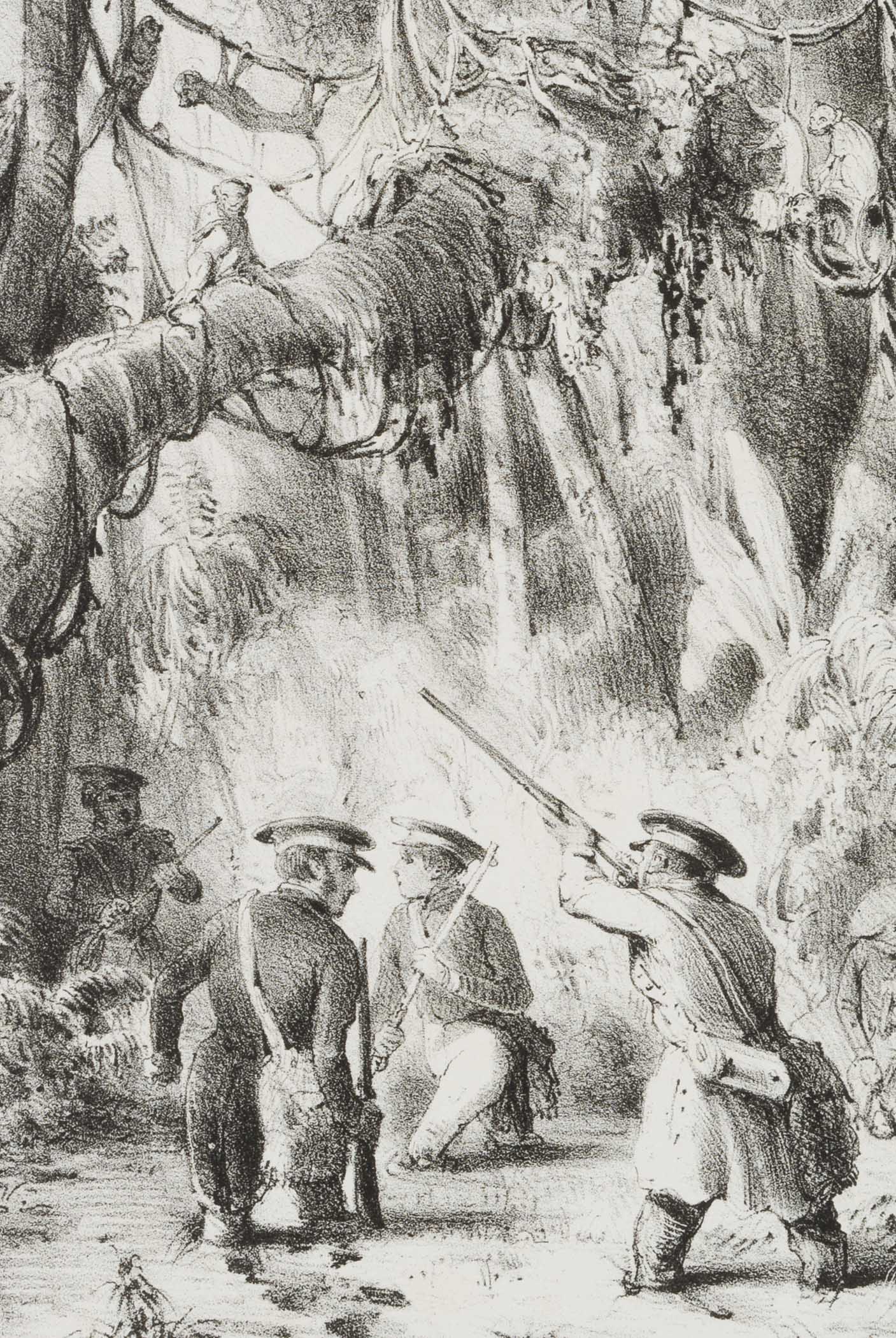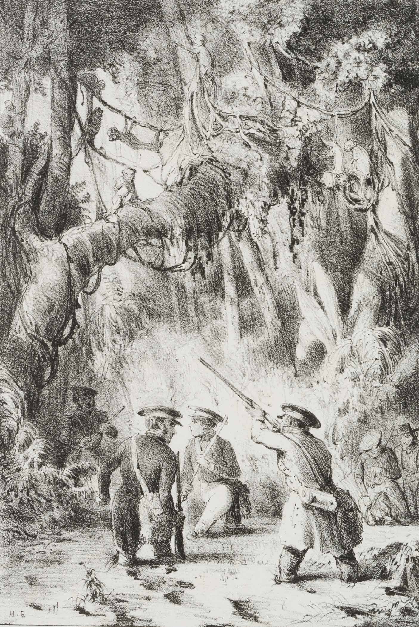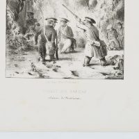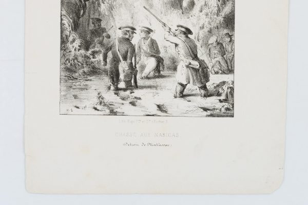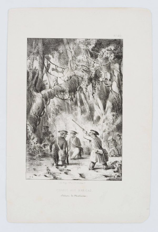 Unbekannt (19. Jahrhundert), ‘Chasse aux nasicas’. Jagd auf Nasenaffen, um 1850, Lithographie