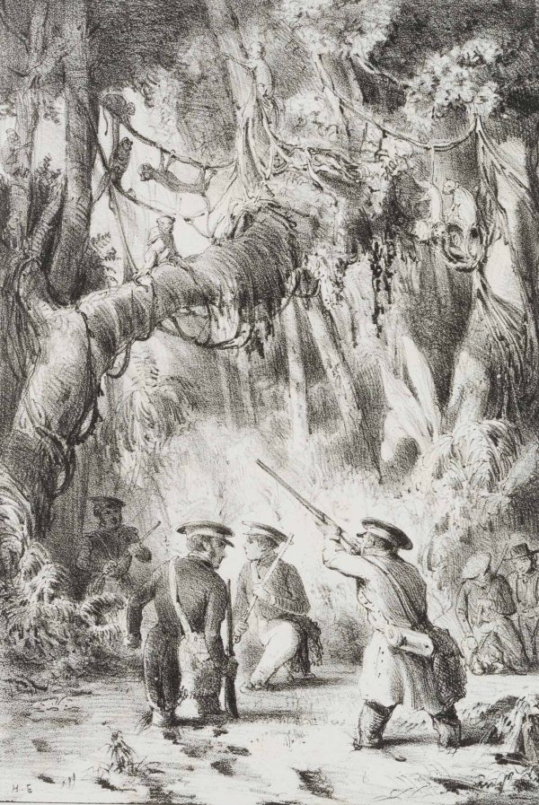 - Beschreibung: In Dschungel mit Jägern, die knöcheltief in einem Gewässer stehen und mit Gewähren auf Affen in den Bäumen zielen