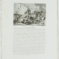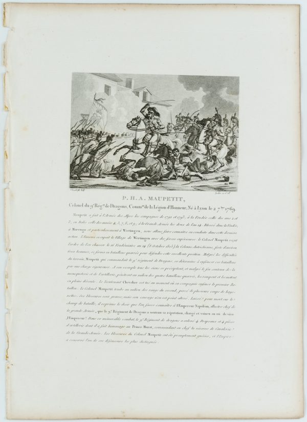 - Beschreibung: bezeichnet ” P. Couché fils. Sculp.”, “Swébac inv. Et. Del.” Zu sehen ist eine Kampfszene während der Napoleonischen Kriege. Im Mittelgrund ist ein Retter mit erhobenem Schwert zu erkennen, eine Truppe von Soldaten stellt sich ihm in den Weg. Zu seinen Füßen im Vordergrund sind verletzte Soldaten und ein Pferd zu erkennen. Rauch steigt aus den umliegenden Häusern auf. Begleitet wird die Darstellung von einem Text, welcher die militärische Karriere des Dargestellten beschreibt.