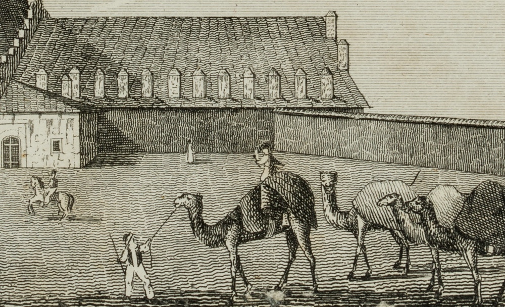 - Beschreibung: ohne Bezeichnung, betitelt “Ein türkischer Chan bei Ghermanloi”. Ansicht einer Herrscher-Residenz eines türkischen Chans. Im Vorhof der Residenz sind vereinzelt Figuren zu erkennen, sitzend und zu Pferd. Im Vordergrund ist eine Karawane mit vier Kamelen und einem Reiter auszumachen, das vordere Tier wird von einem Karawanenführer gezogen, welcher den Weg der Karawane bestimmt.