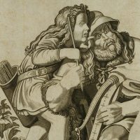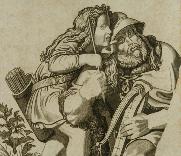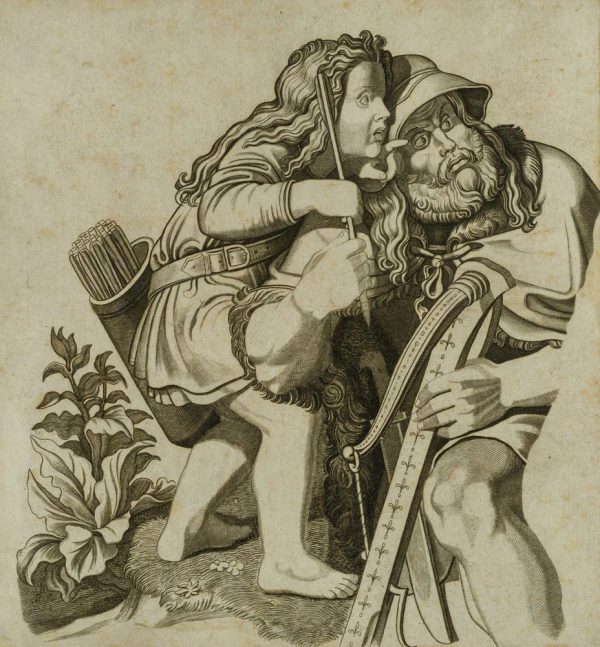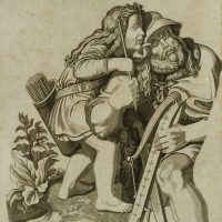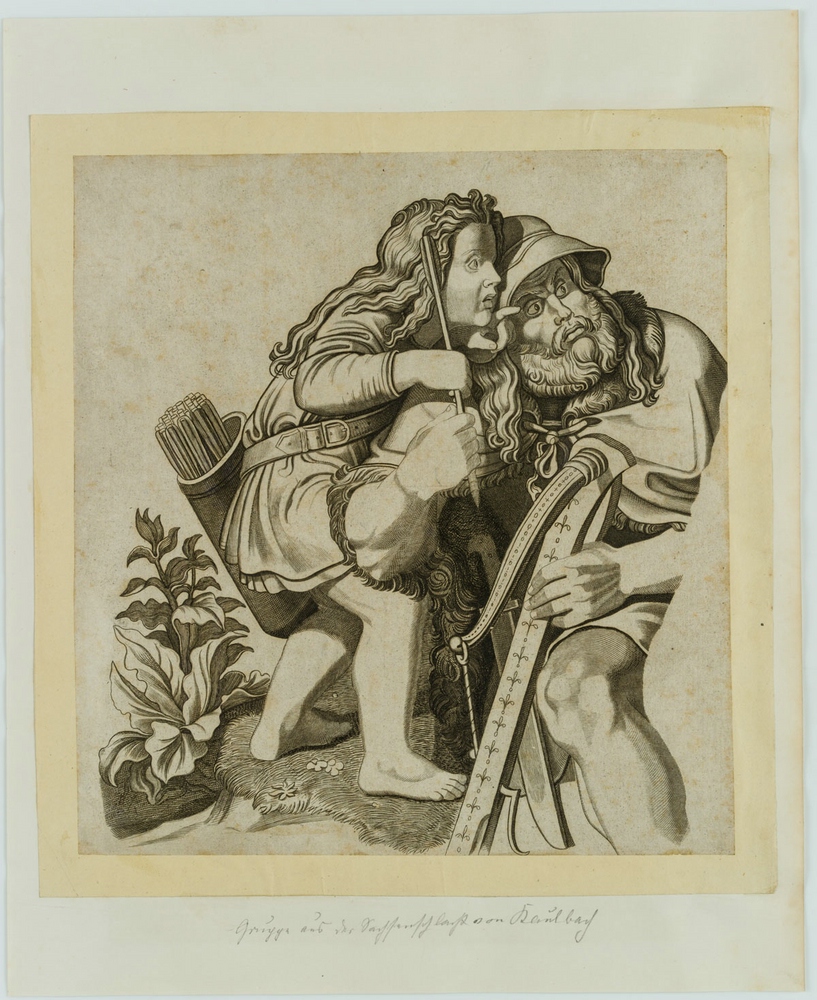 - Description: Without inscription, titled (illegible). The Swiss national hero William Tell is depicted with his son. He went down in history as a freedom fighter because he had once rebelled against the Habsburg bailiff Herrmann Gessler. The latter had demanded that his subjects salute a pole with a hat on it as if it were the bailiff himself. Wilhelm Tell, together with his son, walked past the pole regardless of this demand and was supposed to shoot an apple from his son’s head with bow and arrow as punishment for this disregard. This apple shot finds its way into numerous depictions and is closely linked to the legend of Tell.