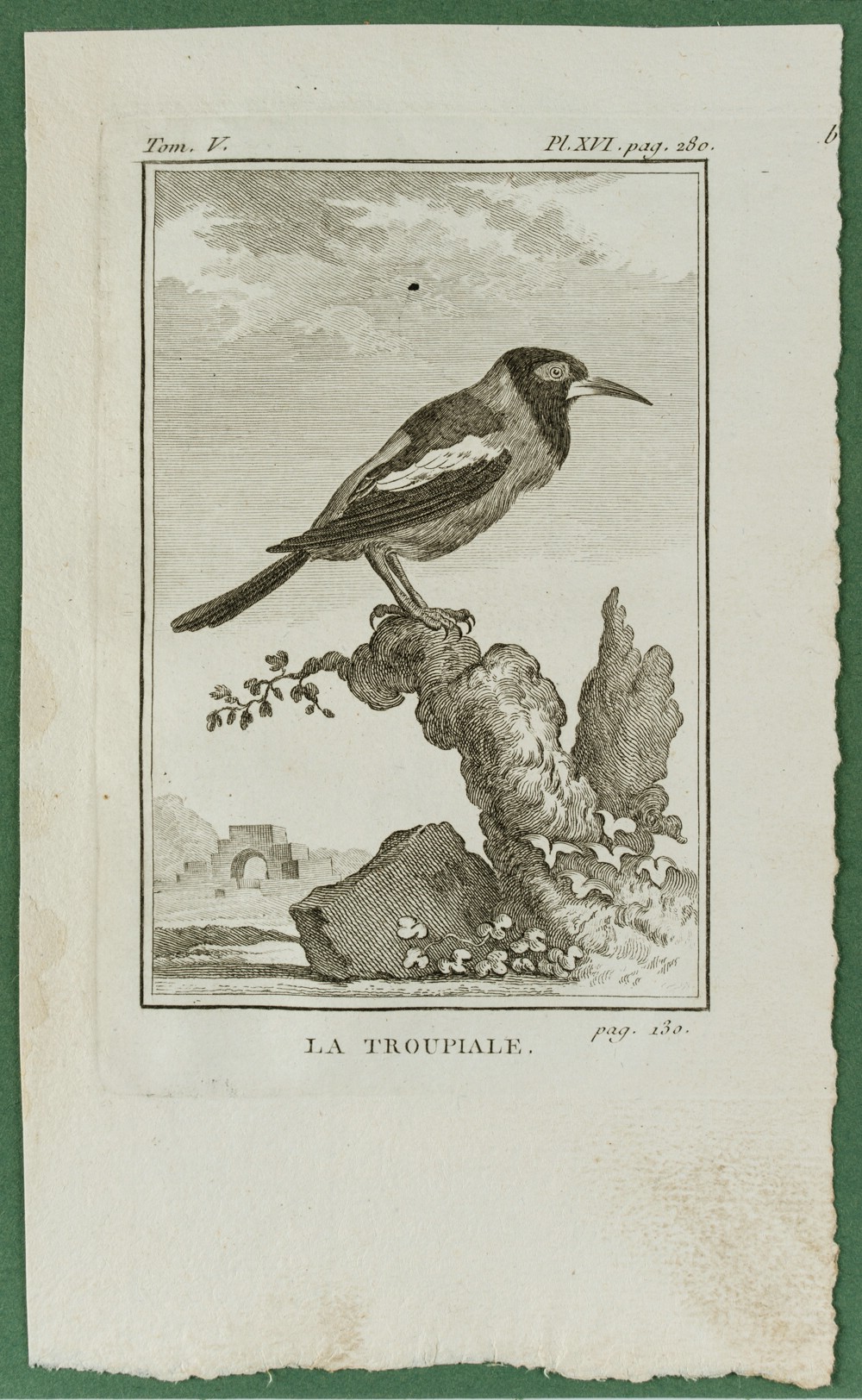 - Beschreibung: Es handelt sich um die ornithologische Darstellung eines Weißflügeltrupials vor pittoresker Umgebung. Die Darstellung stammt aus dem vogelkundlichen Werk Histoire naturelle, générale et particulière. Histoire naturelle des oiseaux. Band 4 von Georges-Louis Leclerc Buffon aus dem Jahr 1838.