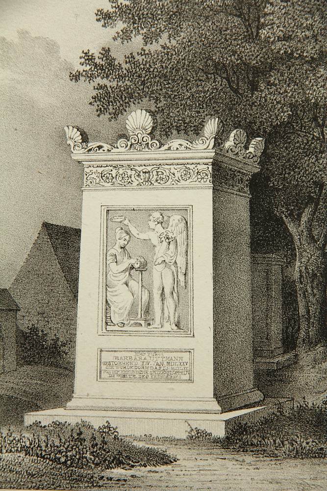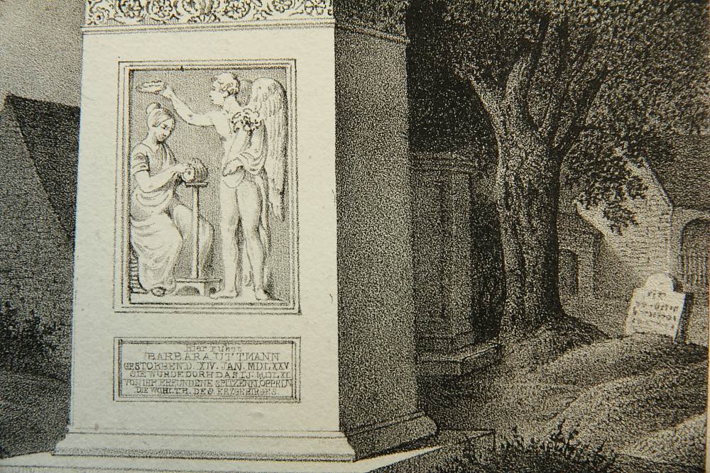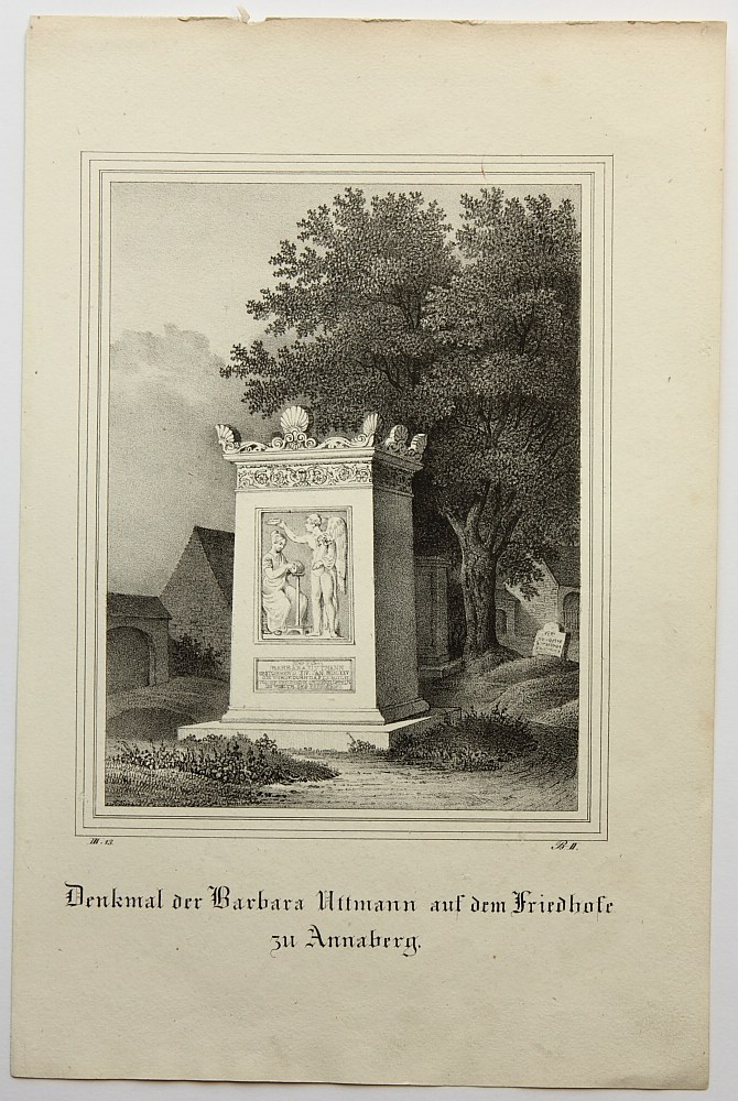 - Bezeichnung: Unterhalb der Darstellung im Druck betitelt: “Denkmal der Barbara Uttmann auf dem Friedhofe zu Annaberg”.