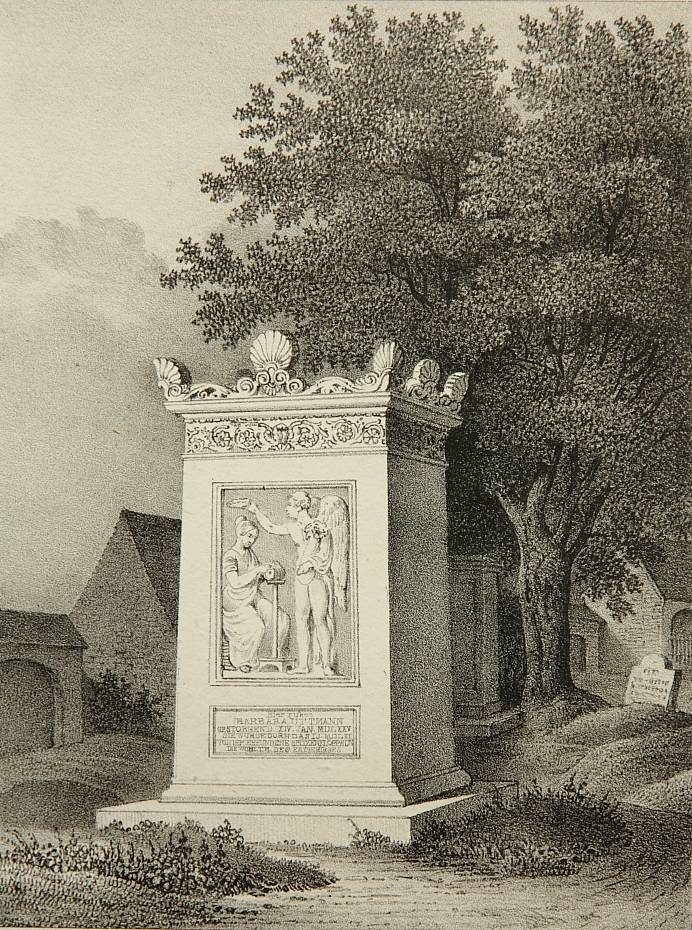 - Inscription: Titled below the image in print: “Monument to Barbara Uttmann in the cemetery at Annaberg”.