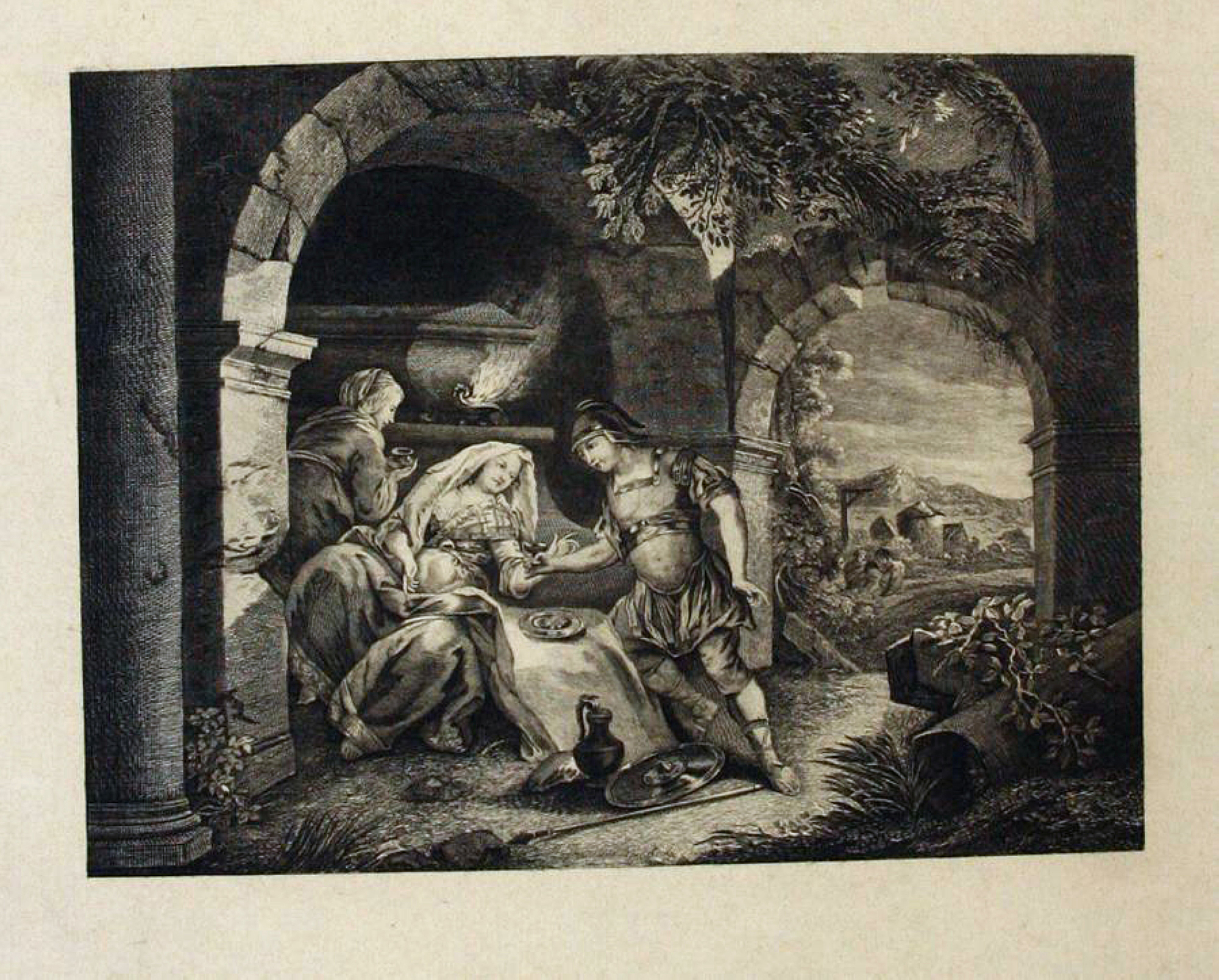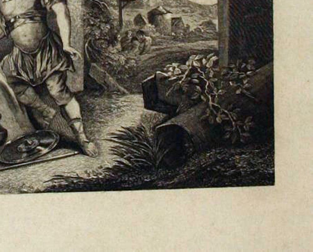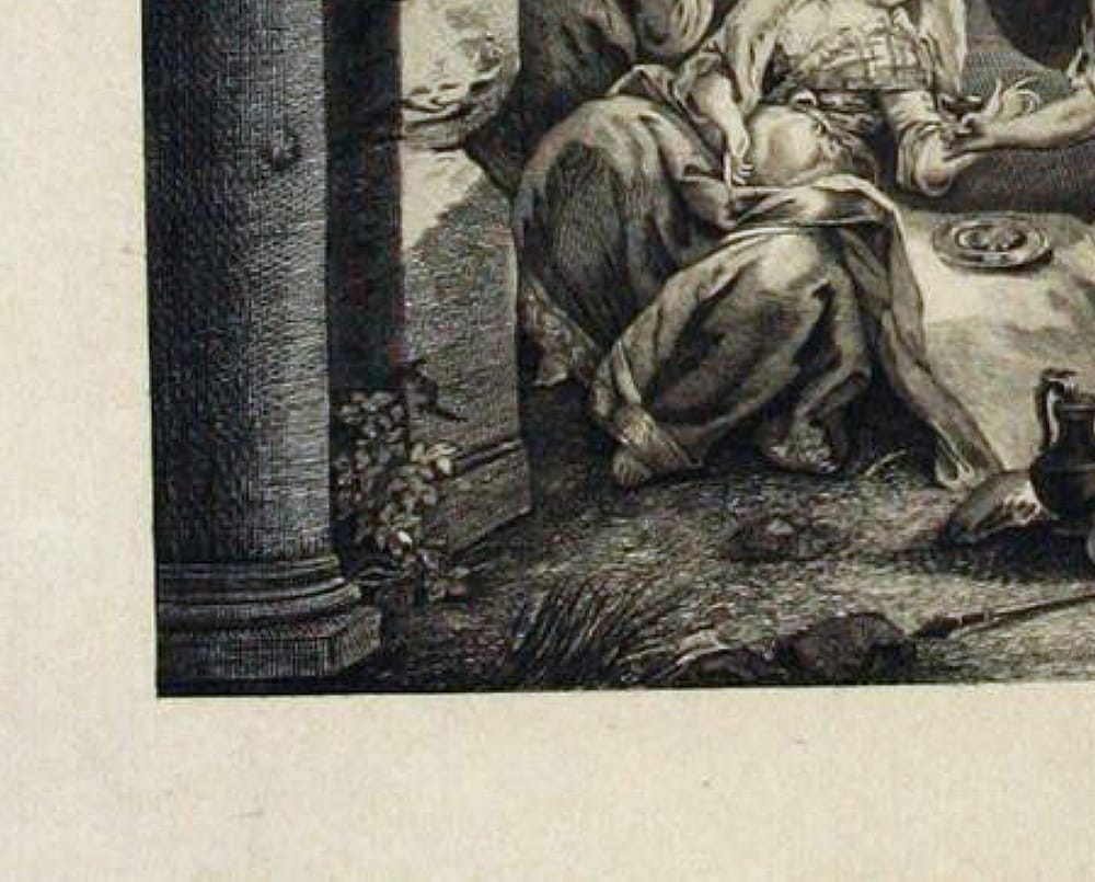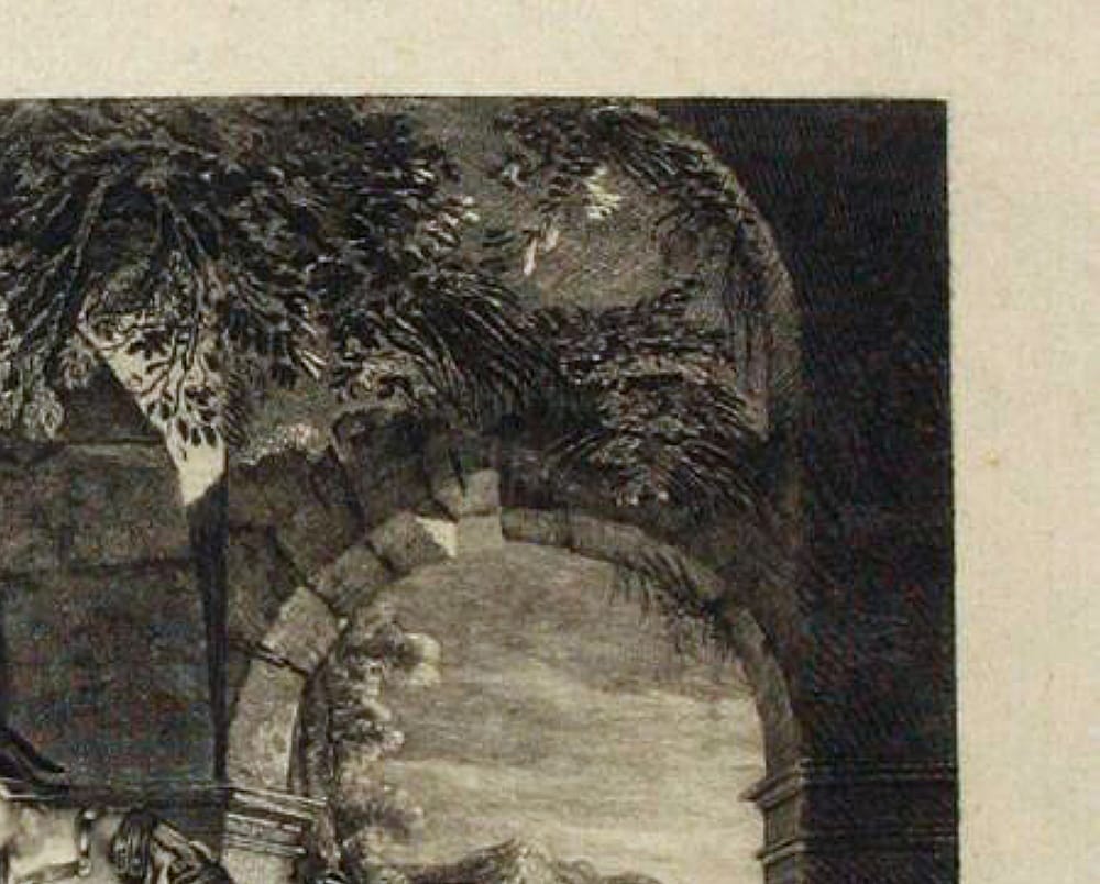 • Description: Depollier, Mysterious Gathering, signed steel engraving, circa 1880. Description:Steel engraving by Depollier, signed in the lower centre of the plate. Mysterious scene in an old crypt. Illuminated by a fire bowl two women and a man can be made out in a decayed crypt. They are drinking from small goblets and talking. A round-arched opening offers a view of the landscape in front of high mountains lies a village, in front of which people have gathered under a gallows. Depollier lived in France around 1880 as an engraver.