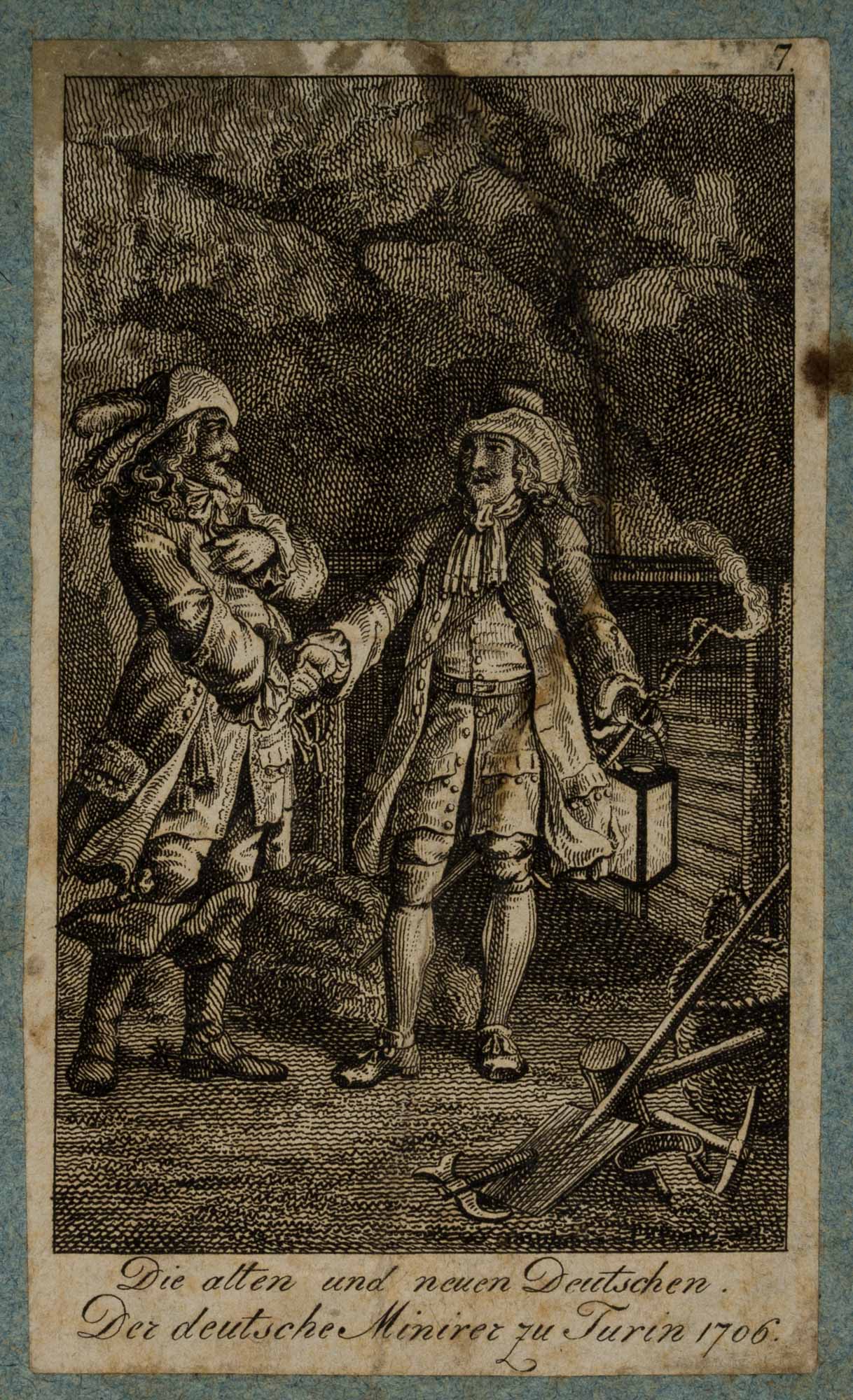 - Bezeichnung: Unterhalb der Darstellung bezeichnet mit “Die alten und neuen Deutschen. / Der deutsche Minister zu Turin 1706”; oben rechts nummeriert “7.”. Darstellung im Rahmen der Schlacht von Turin im Jahr 1706, der größten Schlacht des Spanischen Erbfolgekrieges auf italienischem Boden.