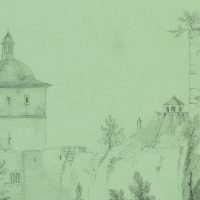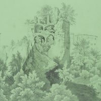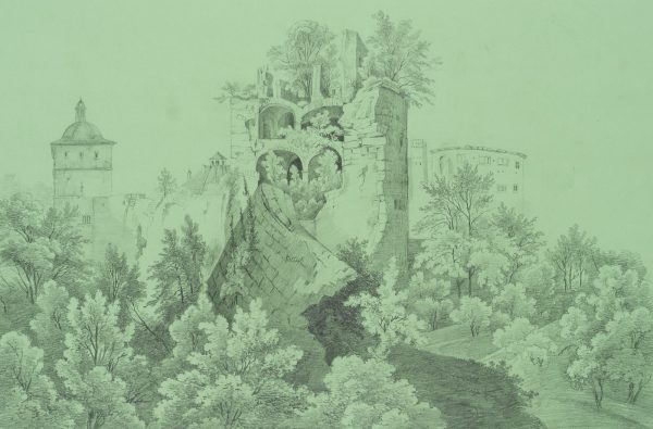 - Description: The Krautturm of Heidelberg Castle, known today as the “Blasted Tower”, was blown up in 1693 in the course of the War of the Palatinate Succession. The massive round tower is made of red sandstone and was partially destroyed. The drawing impressively shows a huge blasted-off piece of wall lying against the tower.