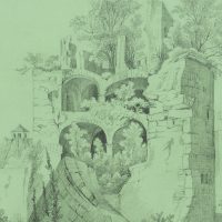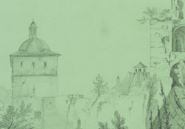 - Beschreibung: Der heute als “Gesprengter Turm” bekannte Krautturm des Heidelberger Schlosses wurde 1693 im Zuge des Pfälzer Erbfolgekriegs gesprengt. Der massive Rundturm besteht aus rotem Sandstein und wurde teilweise zerstört. Die Zeichnung zeigt eindrucksvoll ein riesiges abgesprengtes Mauerstück, das sich eindrucksvoll gegen den Turm legt.