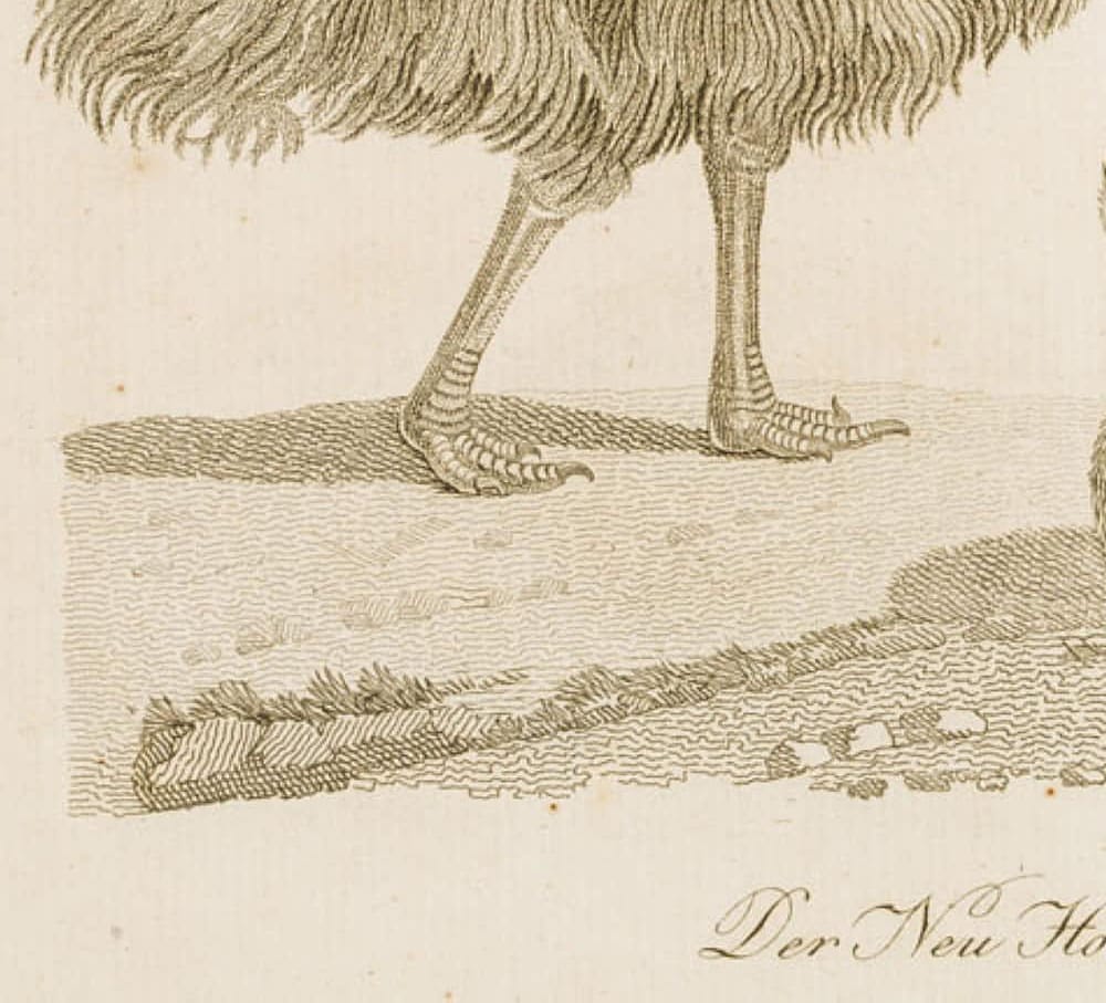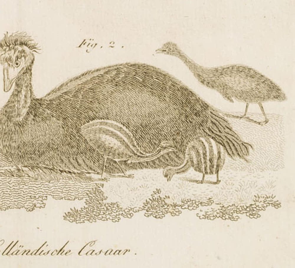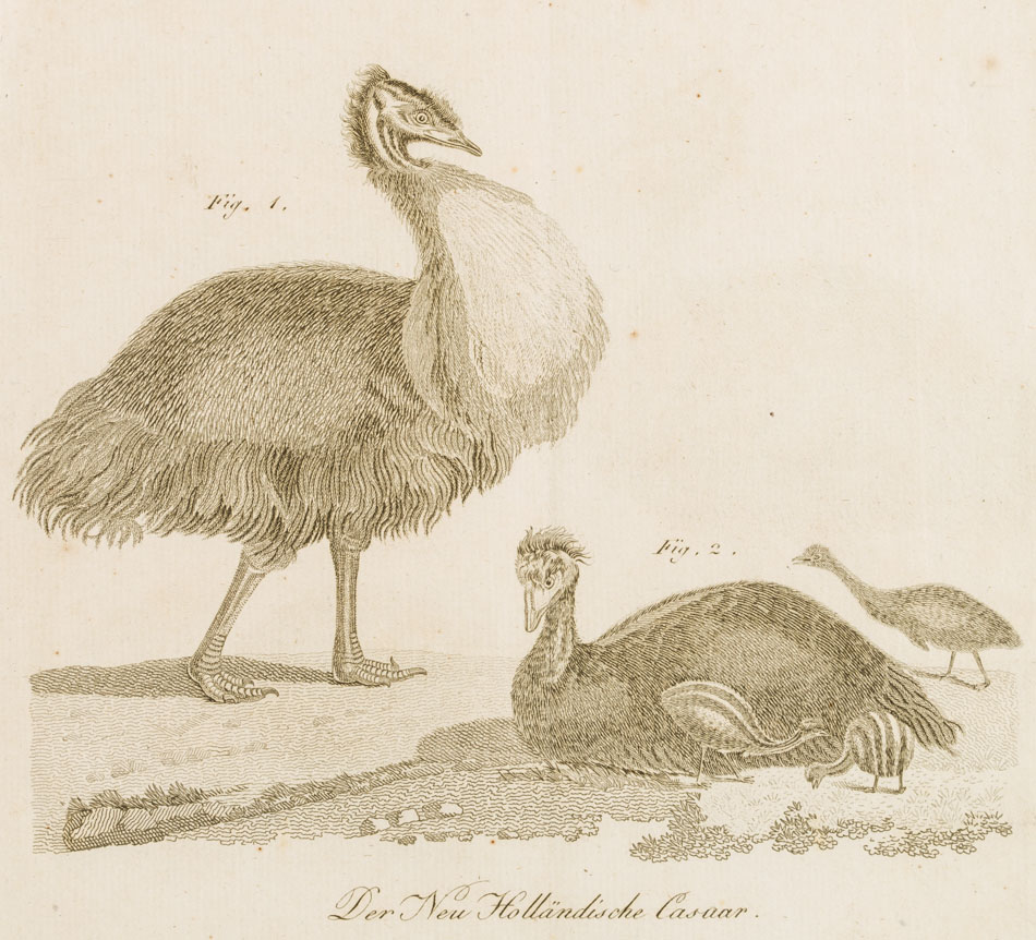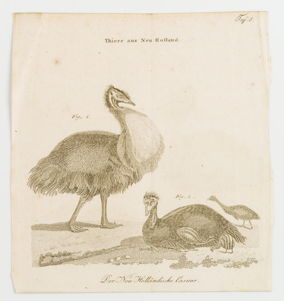 - Bezeichnung: Oben betitelt: “Thiere aus Neu Holland.” Unten betitelt: “Der Neu Holländische Casuar.”