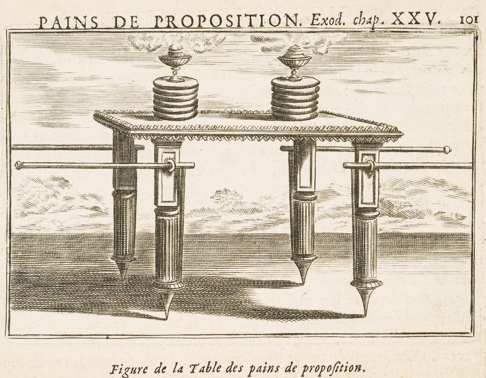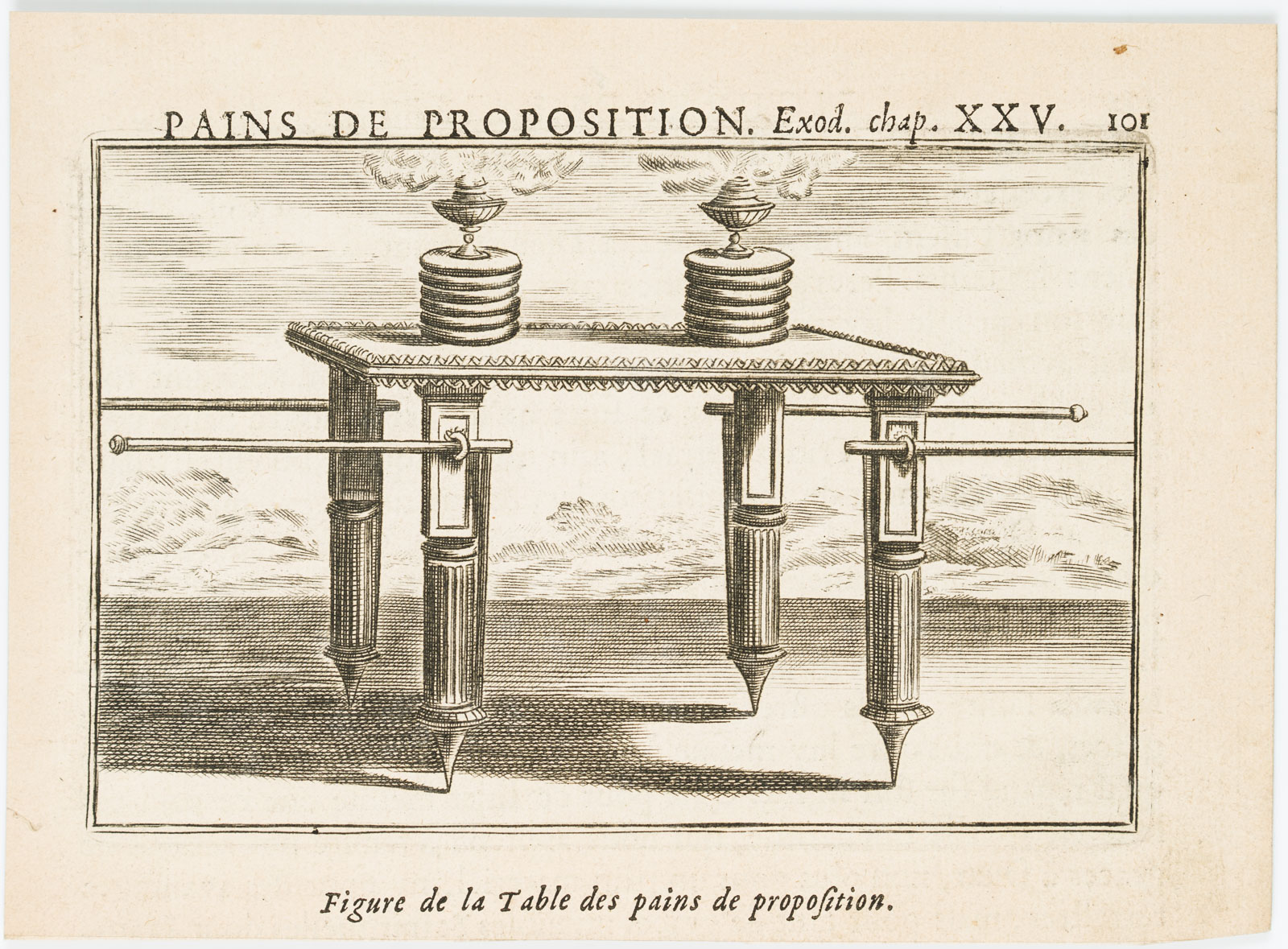 - Description: Inscribed and numbered above the image: “Pains de Proposition. Exod. Chap. XXV. / 101”, titled below the depiction. The table depicted for the shewbread was a Jewish ritual item. It is described in the Torah and was part of the inventory of the Jerusalem Temple.