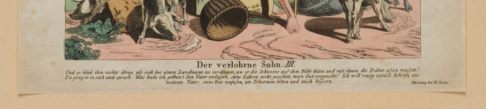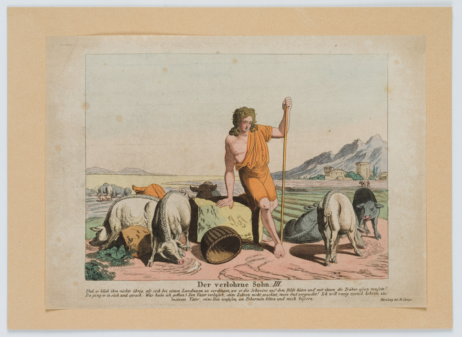 Unbekannt (19. Jahrhundert), Bibelillustration ‘Der verlorene Sohn’, Blatt III., Szene des schweinhirtenden Sohnes, 19. Jahrhundert, Farblithographie