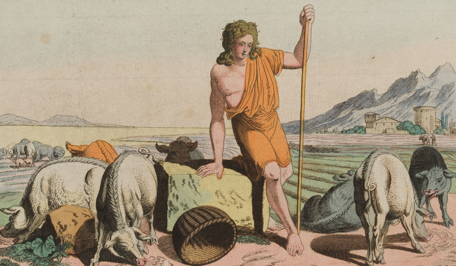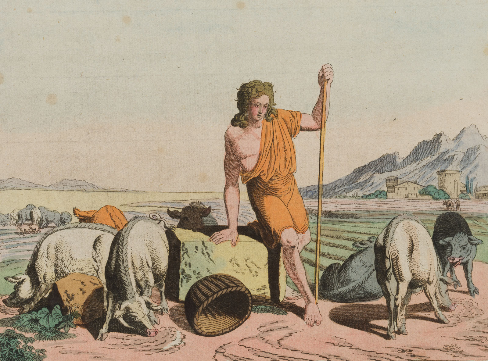 Unknown (19th century), Bible illustration ‘The Prodigal Son’, sheet III, scene of the pig-herding son, 19th century, Colour lithography