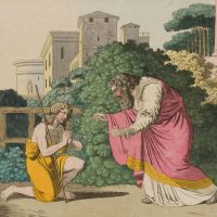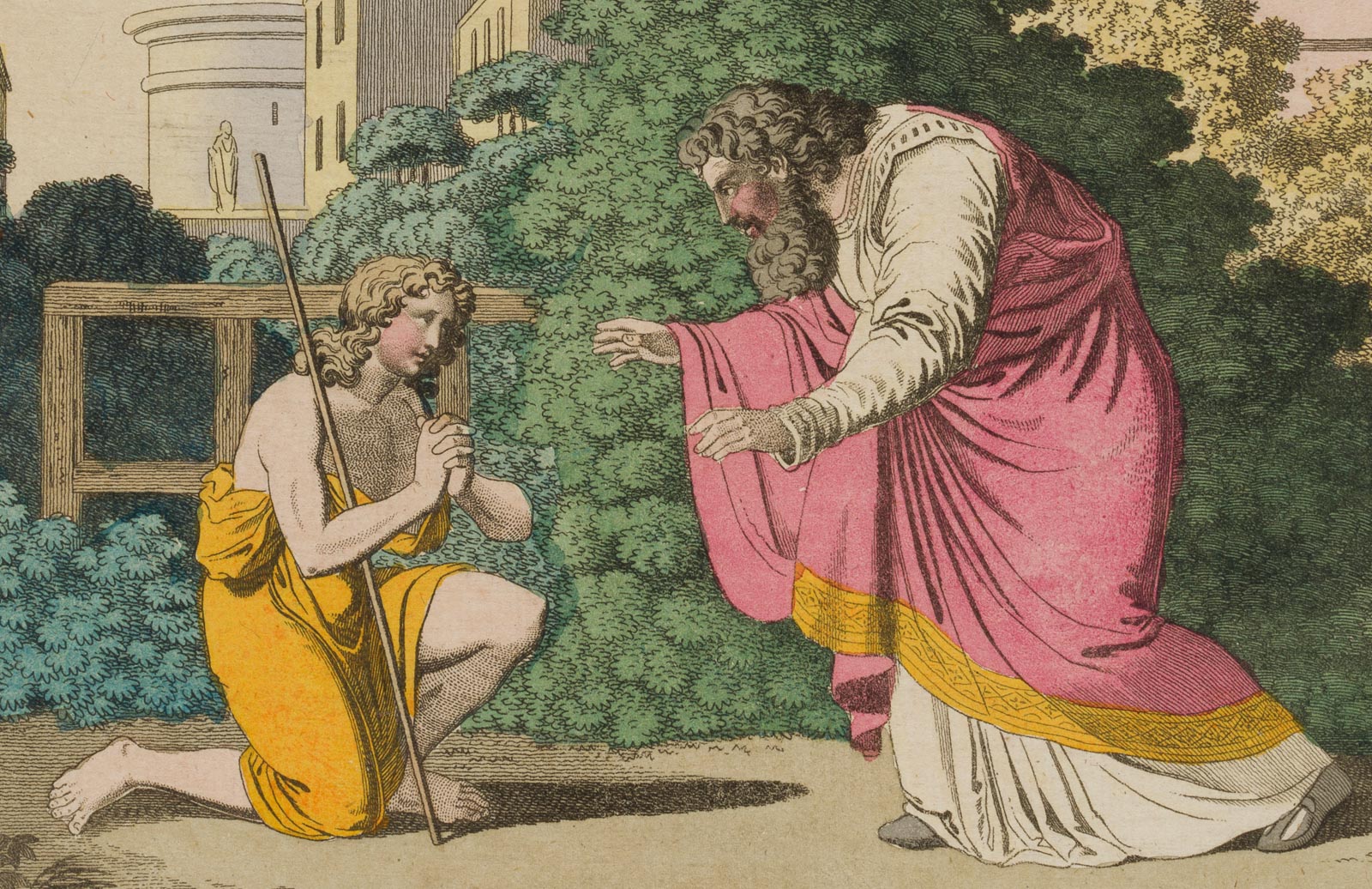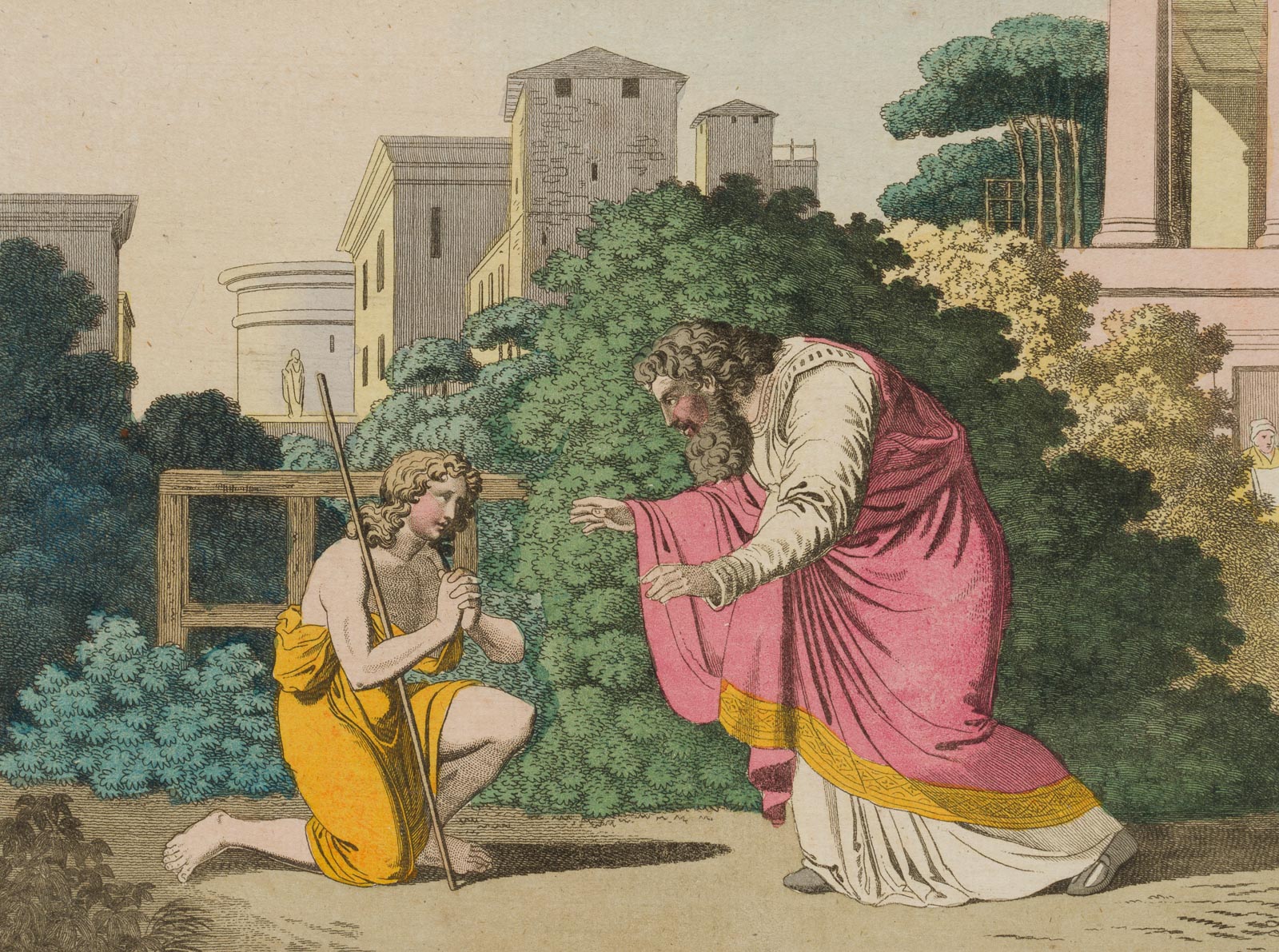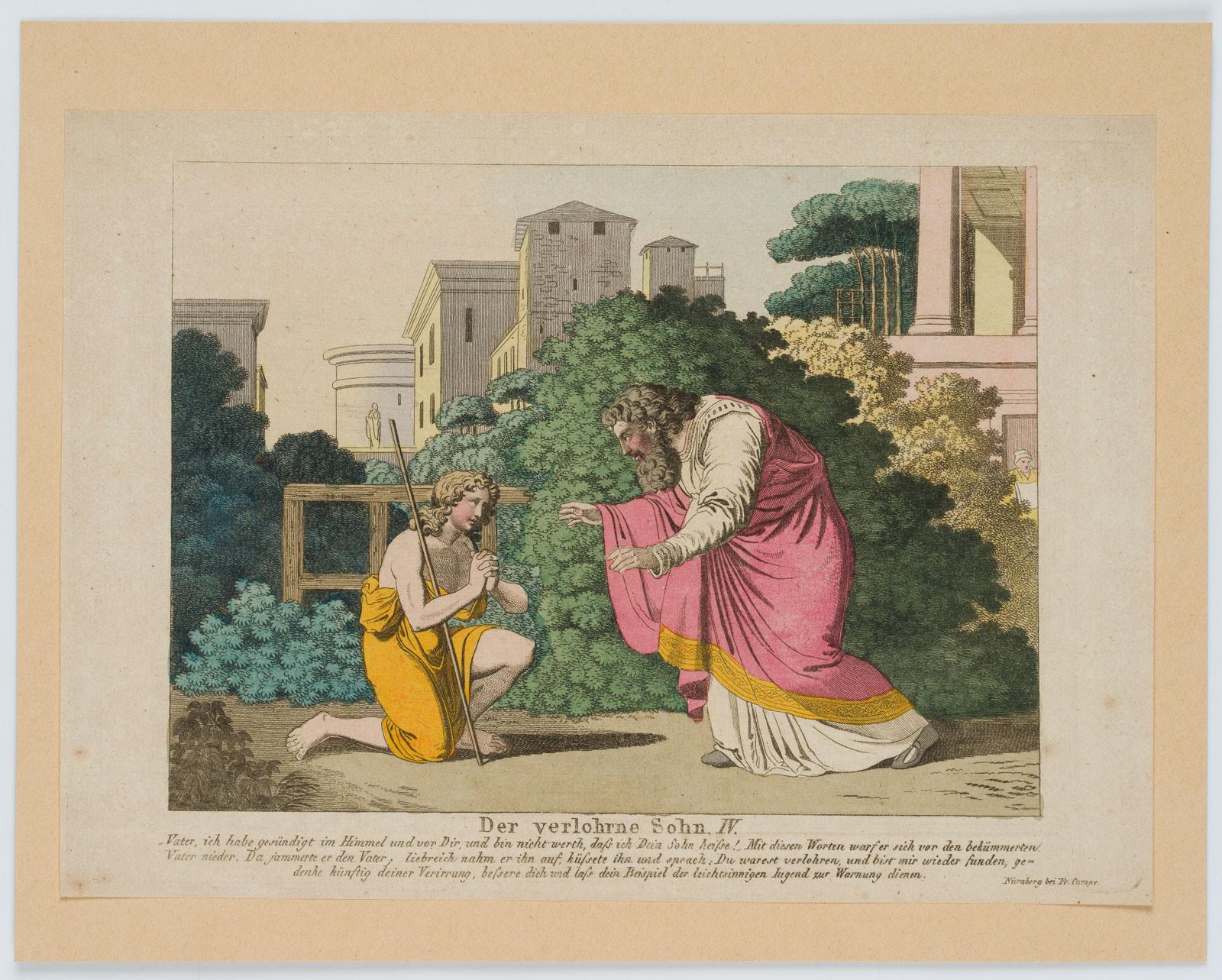 Unbekannt (19. Jahrhundert), Bibelillustration. Der verlorene Sohn, Blatt IV., Szene des zurückkehrenden Sohnes, der seinen Vater um Verzeihung bittet, 19. Jahrhundert, Farblithographie