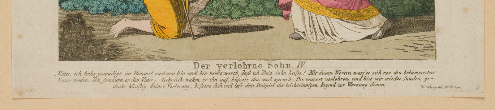 - Inscription: Inscribed below and accompanied by a narrative text. With indication of the publisher: “Nürnberg bei Fr. Campe”. August Friedrich Campe (1777 Holzminden – 1846 Nuremberg) was a bookseller and ran a publishing house primarily of the Enlightenment type. In 1825 he enforced the new stock exchange regulations in Leipzig and became co-founder and first director of the Börsenverein Deutscher Buchhändler.