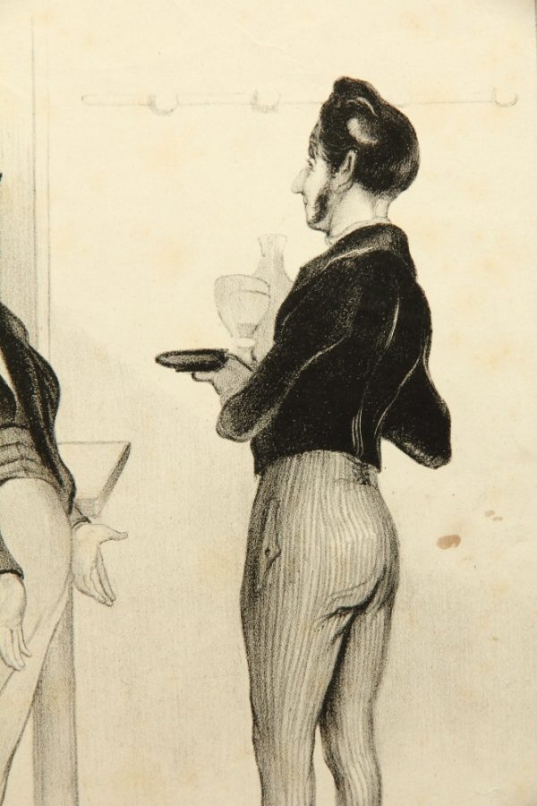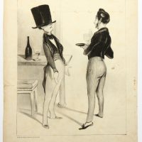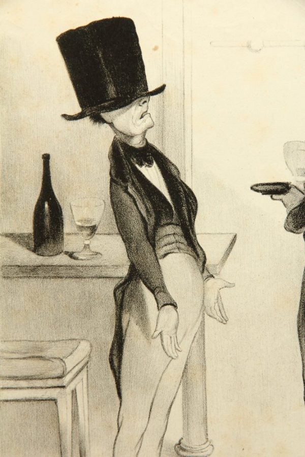 Unbekannt (19. Jahrhundert), “Der verwechselte Hut”, Karikative Darst. mit übergroßem Zylinder, 19. Jahrhundert, Lithographie
