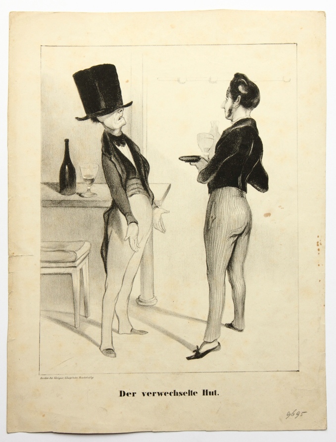 - Beschreibung: Der verwechselte Hut , Karikative Darstellung mit übergroßem Zylinder, 19. Jahrhundert, Lithographie. Beschreibung: Lithographie auf Papier. Unterhalb der Darstellung im Stein mit den Daten des Verlegers versehen und betitelt. Rückseitig befindet sich der Stempel des “KOEN[IGLICH]. PR[EUSSISCHEN]. POLIZEI PRAESIDIUM ZU BERLIN”.