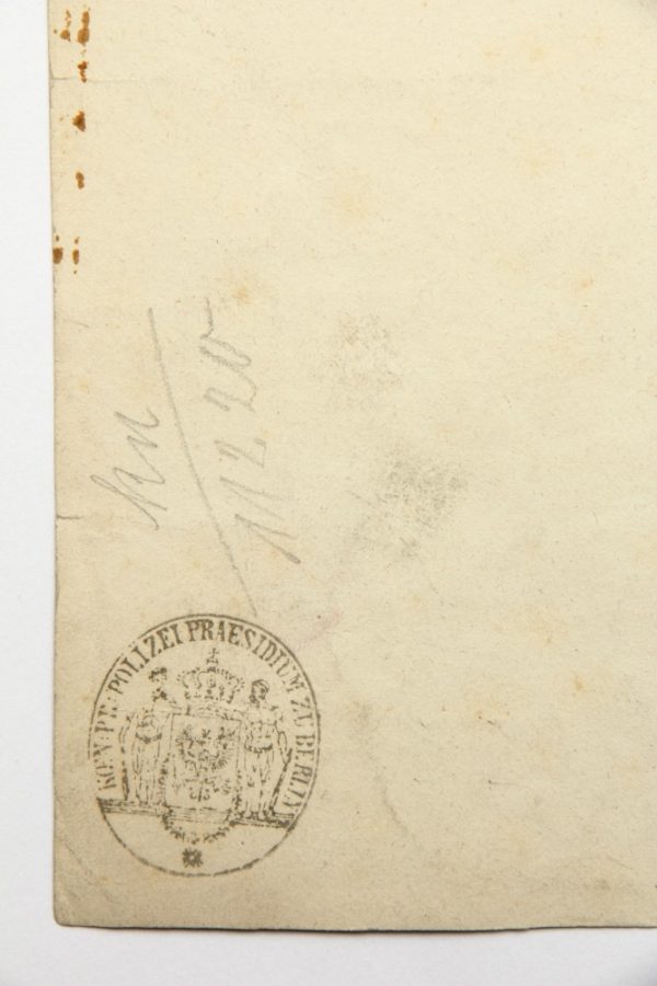 - Inscription: Inscribed with the publisher’s data and titled in the stone below the image. On the reverse is the stamp of the “KOEN[IGLICH].PR[EUSSISCHEN].POLIZEI PRAESIDIUM ZU BERLIN”.