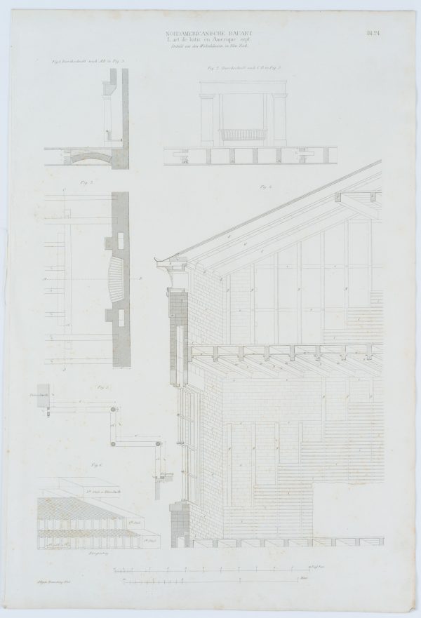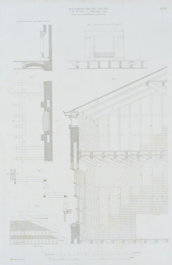 Unbekannt (19. Jahrhundert), Architekturdarstellung, “Details von den Wohnhäusern in New York”, Nordamerikanische Bauart, “L’art de batir en Amérique sept.”, Bauwesen, 1846, Lithographie