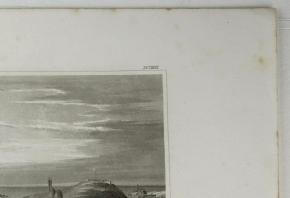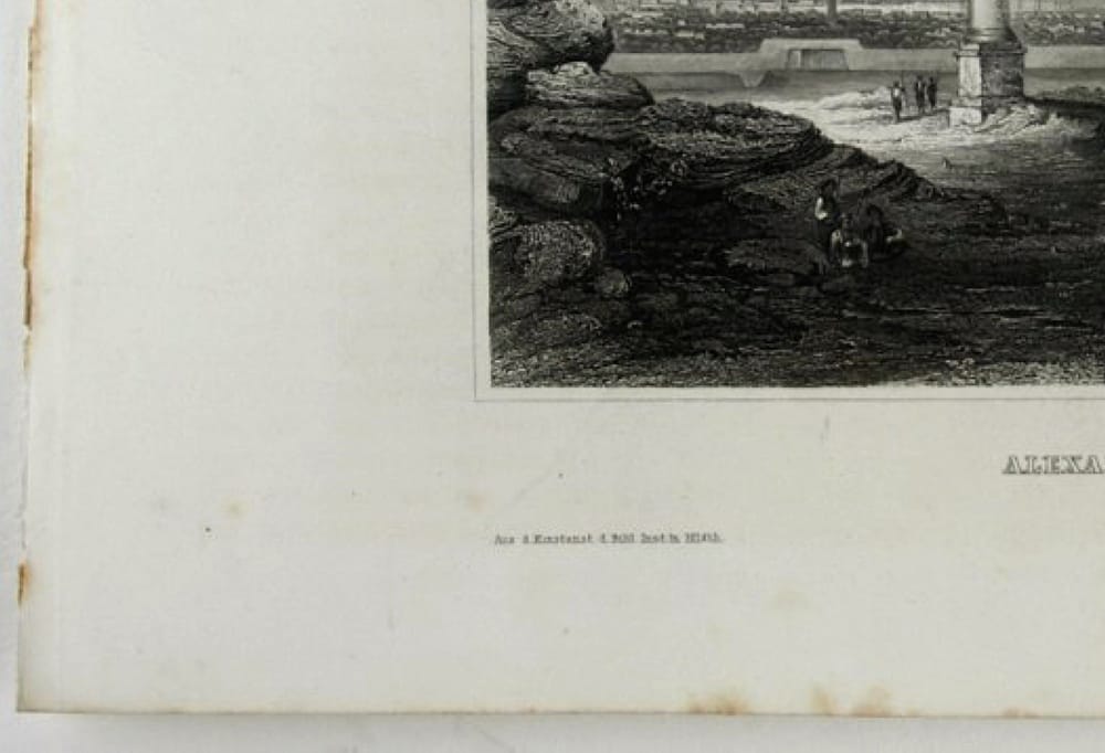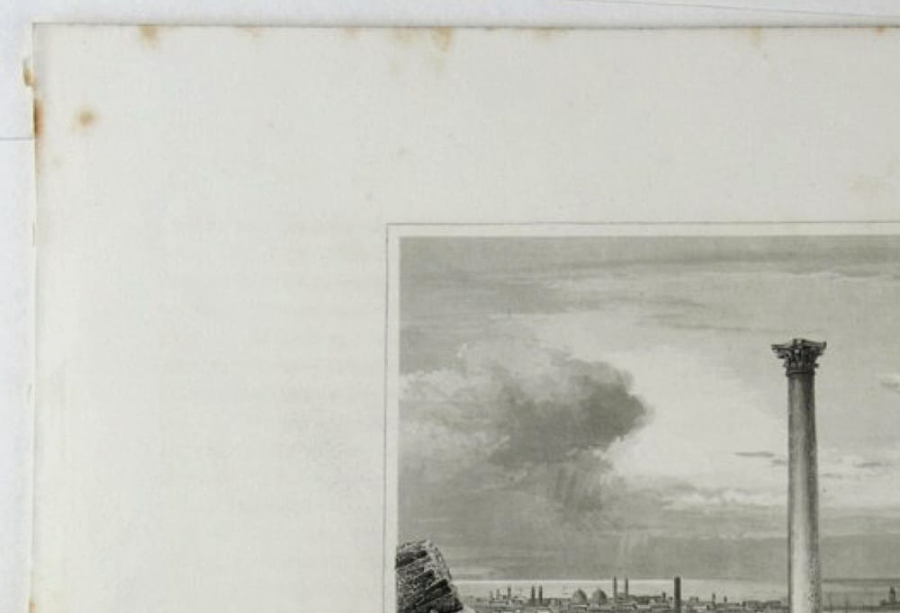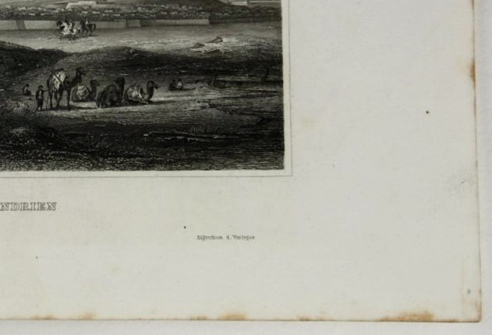 - Beschreibung: Stahlstich eines deutschen Künstlers, bezeichnet oben rechts: “DCCXXVI”, unten: “Alexandrien Aus d. Kunstanst. d. Bibl. Inst. in Hildbh. Eigenthum d. Verleger”. Sehr schöne Ansicht Alexandrias mit Pompeiussäule und Kameltreibern. Diese freistehende, etwa 26 Meter hohe Säule war eine römische Triumphsäule. Im Hintergrund liegt die Hafenstadt mit ihren Türmen und Kuppeln sicher hinter einer mächtigen Stadtmauer.