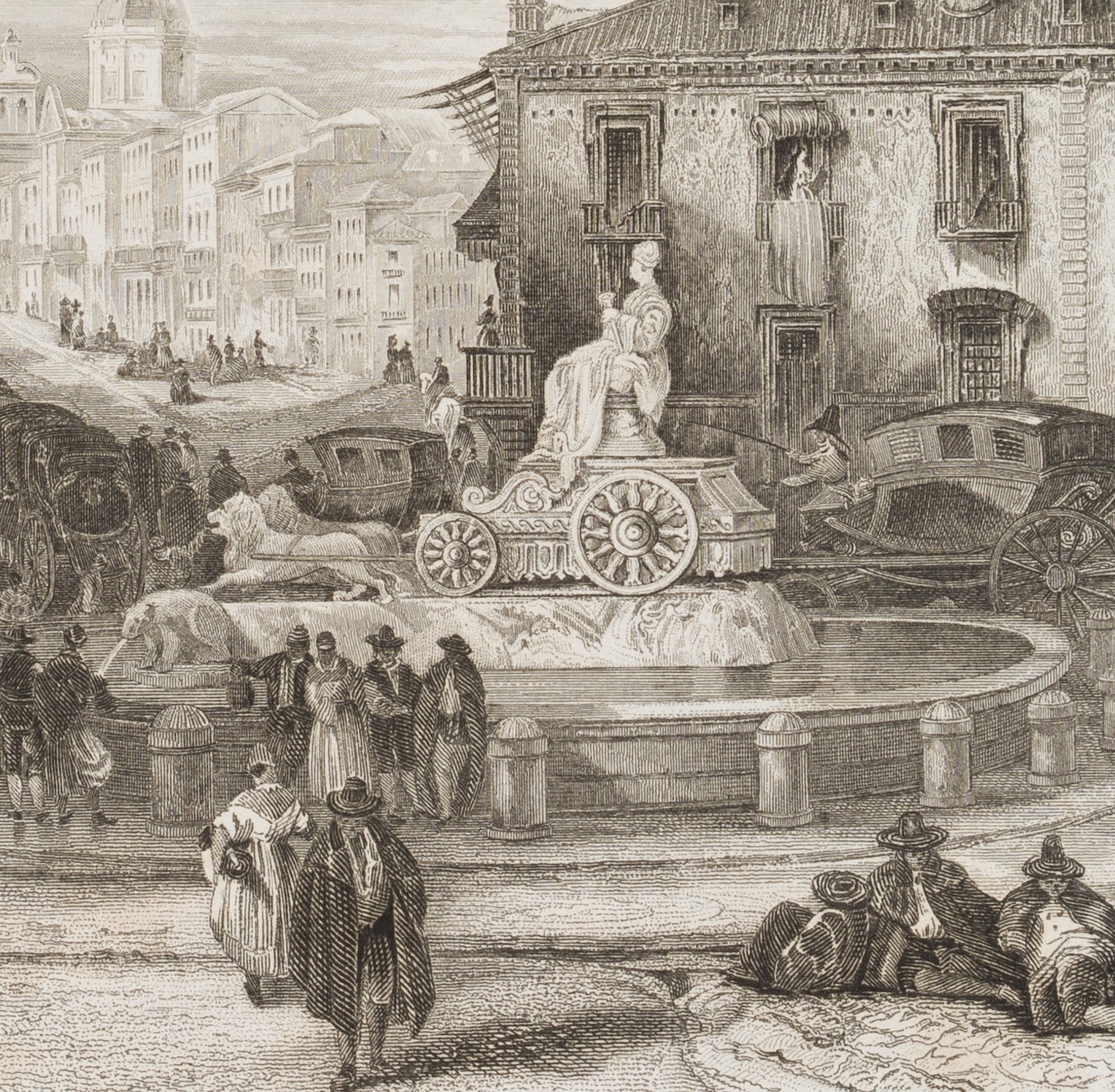 - Description: View from the Plaza de Cibeles over the Fuente de Cibeles through the streets of Madrid. With many figures in costumes typical of the time and place.