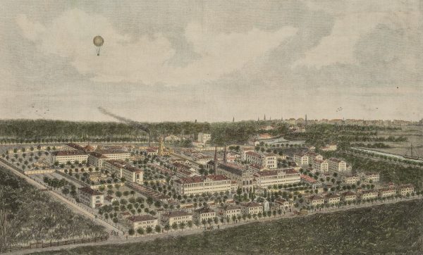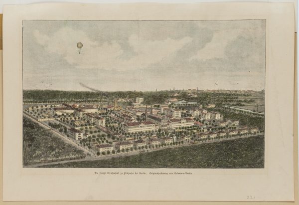 - Description: Bird’s-eye view of the Prussian state prison Plötzensee with a detailed depiction of the prison wings and officials’ residences. The neo-Gothic church of the prison is in the centre. Above the prison hovers a hot air balloon as a symbol of freedom, almost as a sign of mockery to the inmates.