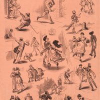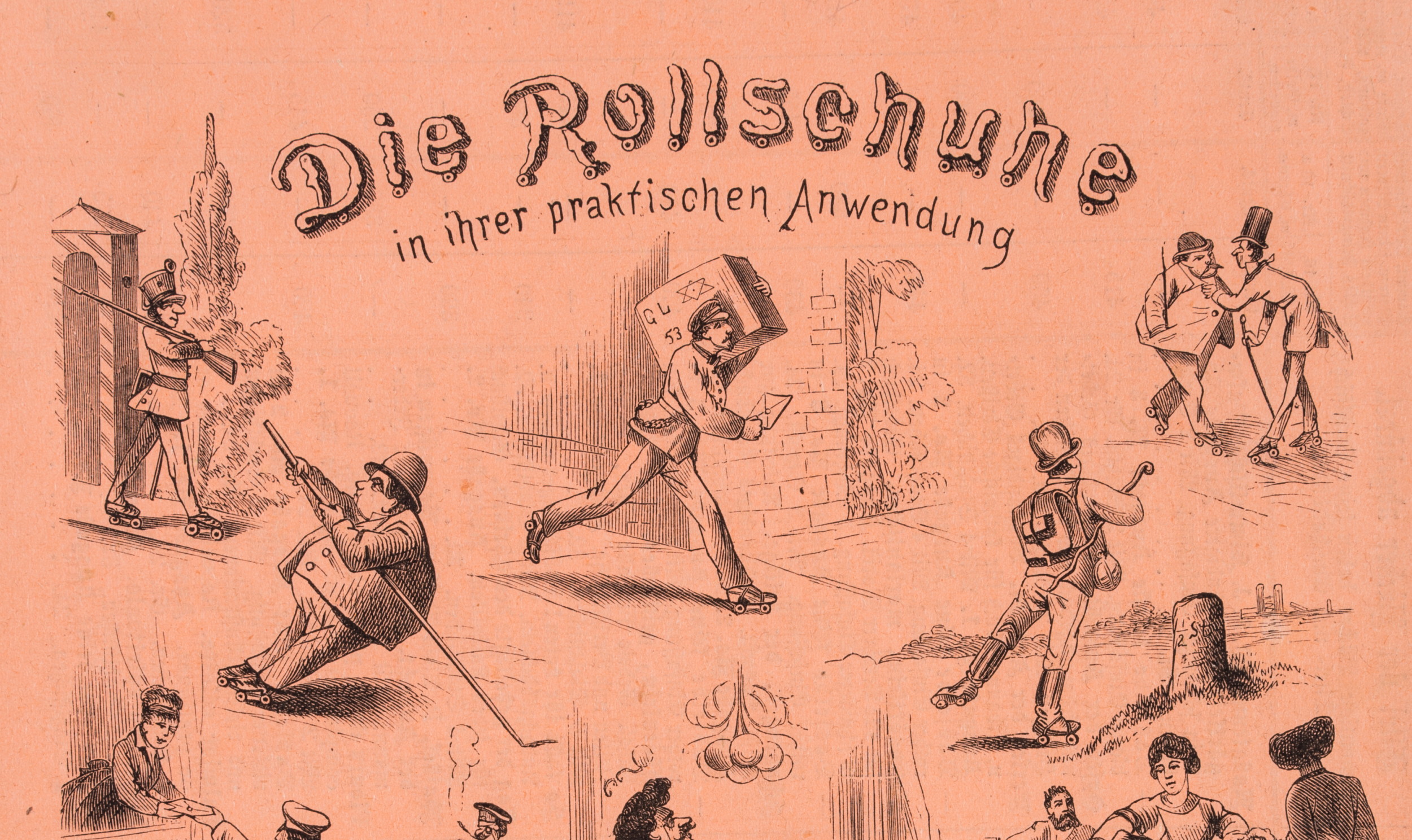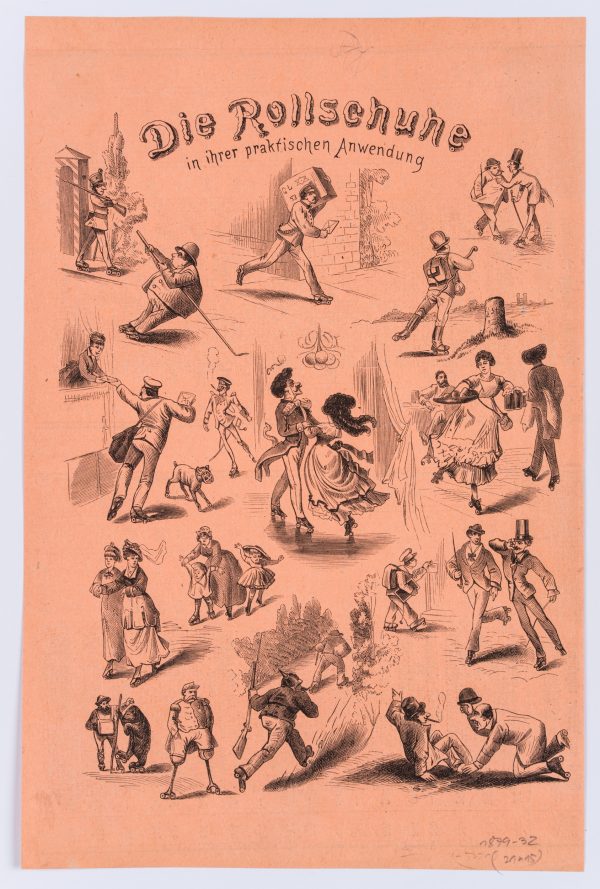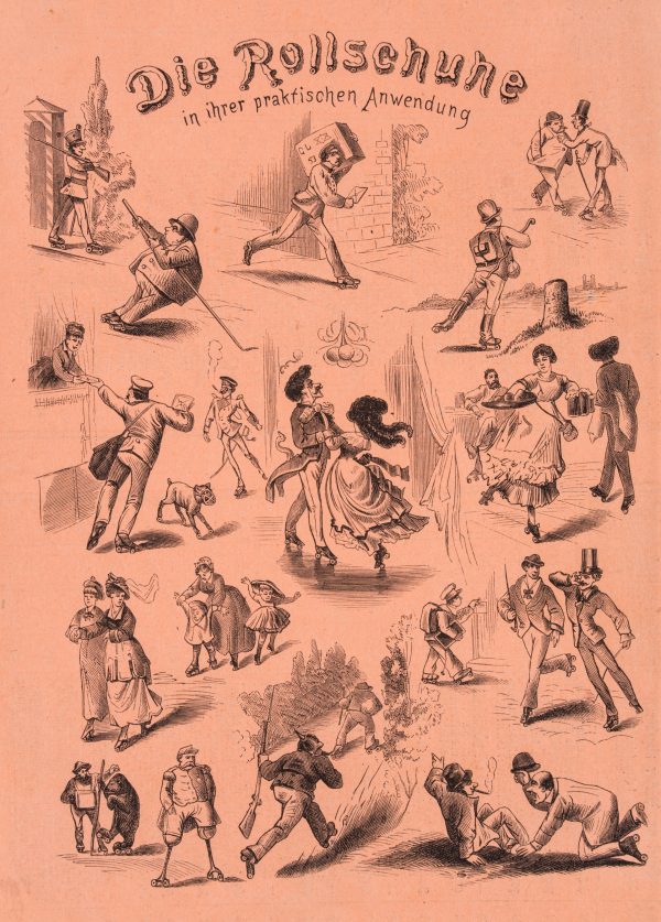 - Beschreibung: Satirische Darstellung aus einer Zeitschrift. Unterteilt in verschiedene kleine Szenen sind Männer und Frauen jeglichen Alters und Standes mit ihren Rollschuhen gezeigt.