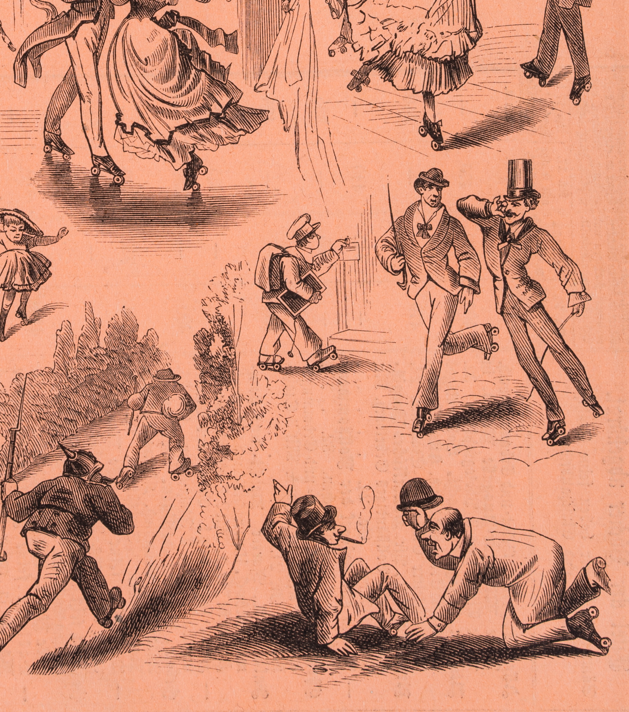 - Description: Satirical illustration from a magazine. Divided into various small scenes, men and women of all ages and status are shown with their roller skates.