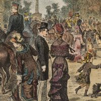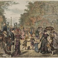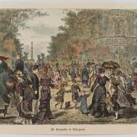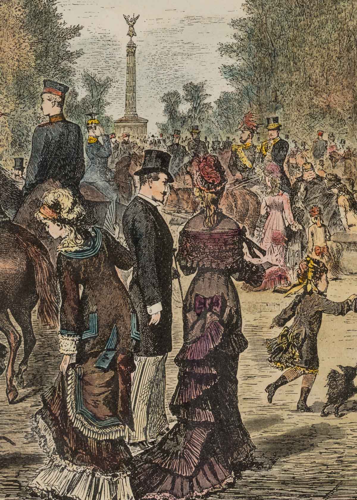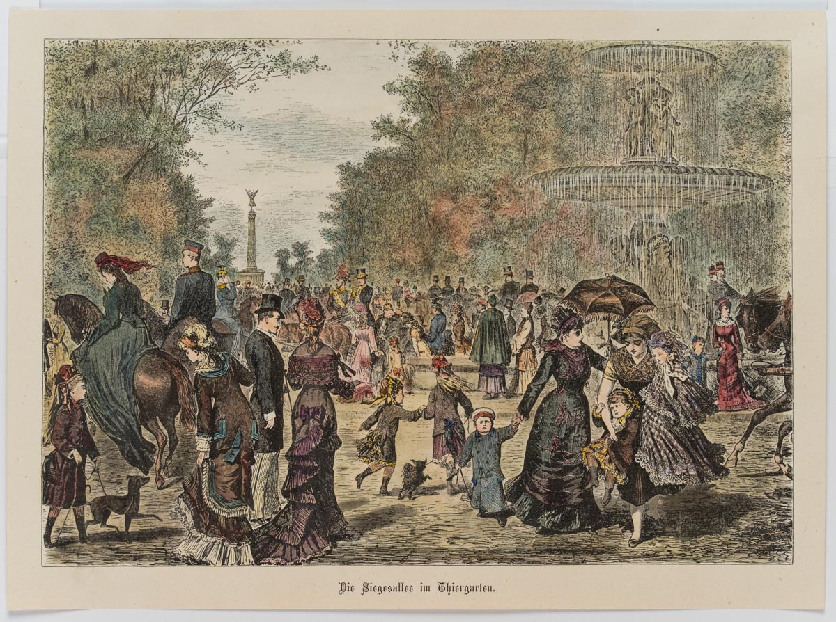- Description: Lively scene in Berlin’s Tiergarten. In the park near the Victory Column, numerous citizens in elegant Wilhelminian style clothing are strolling. In front on the right is a nanny with some lively boys and girls.