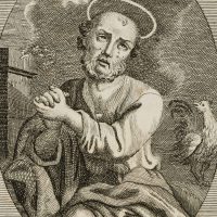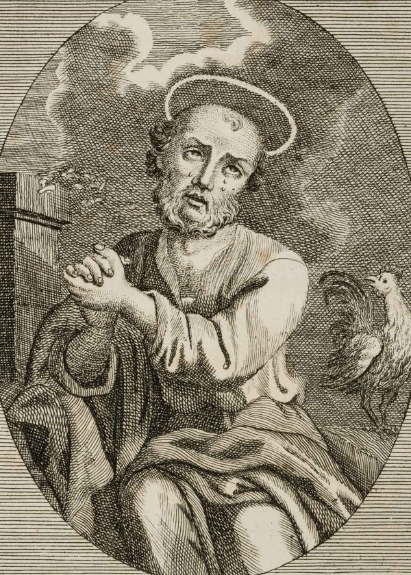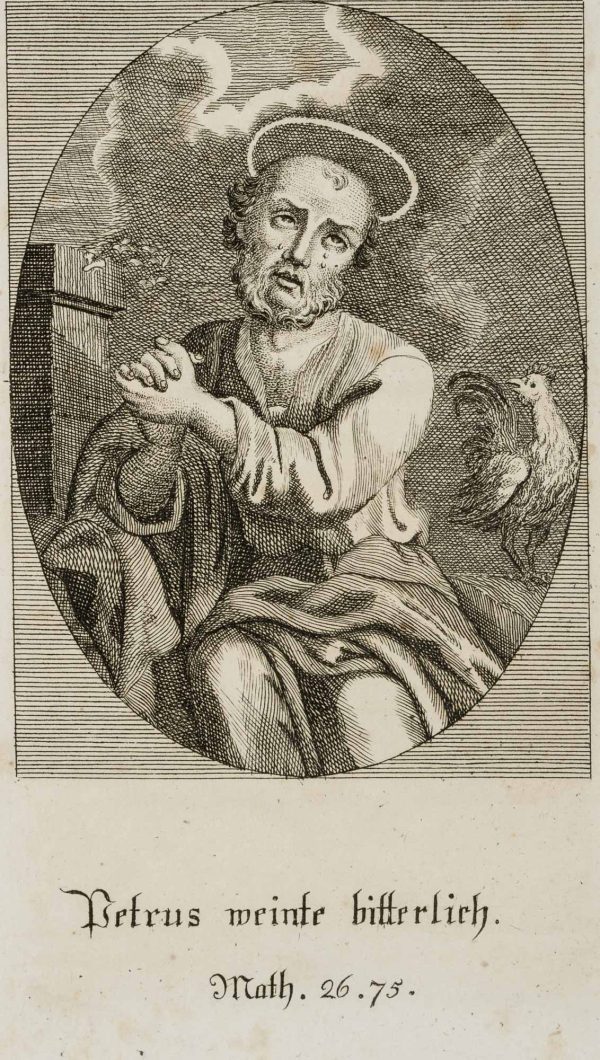 Darstellung aus dem Matthäuse Evangelium, wo von der dreimaligen Verleugnung von Jesus durch den Apostel Petrus berichtet wird. So heißt es in Matthäus 26.75 “Da dachte Petrus an die Worte Jesu, da er zu ihm sagte: “Ehe der Hahn krähen wird, wirst du mich dreimal verleugnen”, und ging hinaus und weinte bitterlich.”
