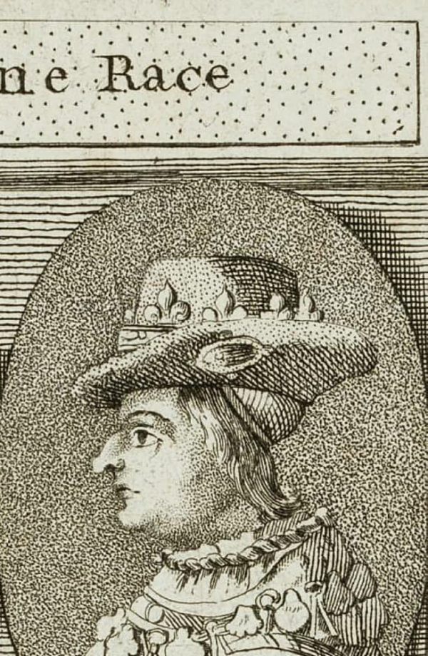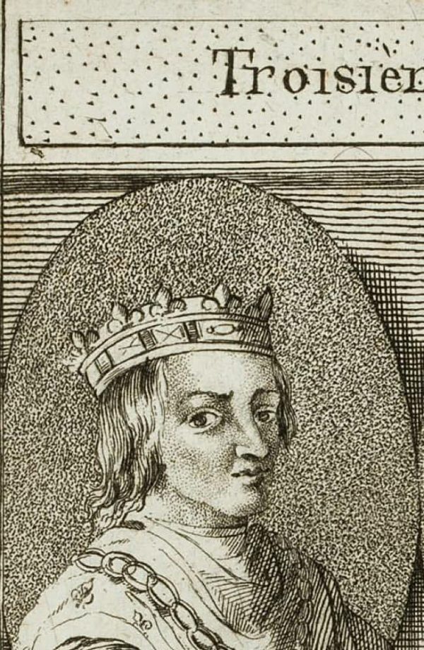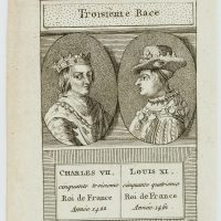 - Description: Double portrait titled „Troisieme Race“ above, inscribed below with the life dates of the two kings depicted.