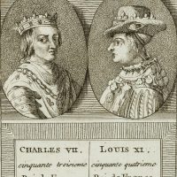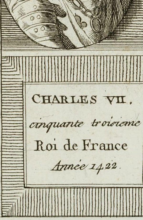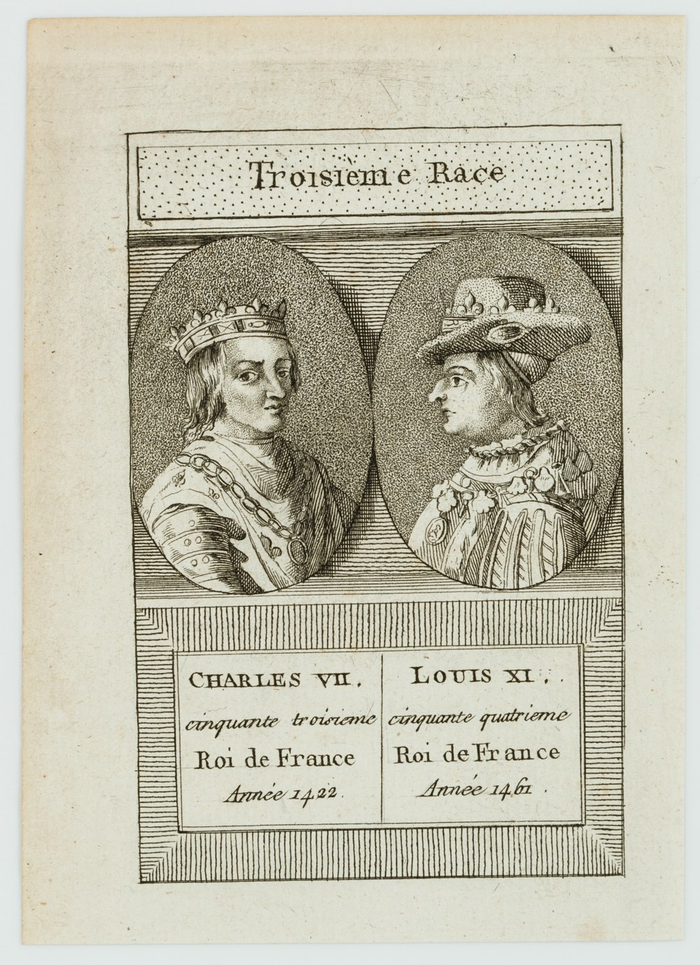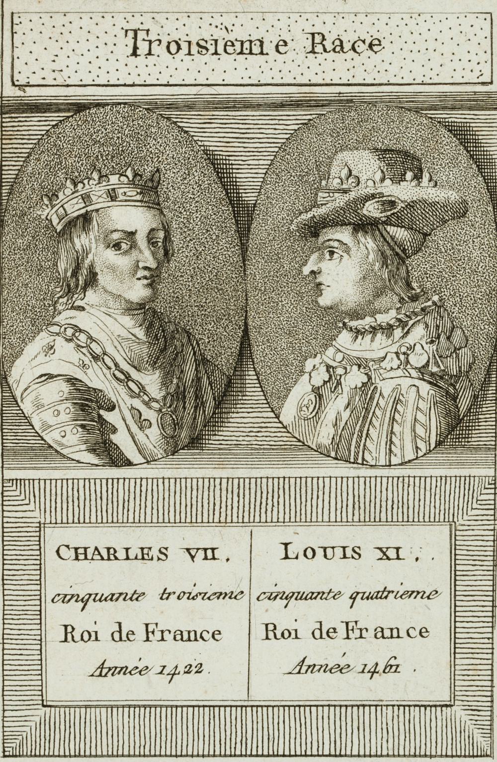 - Bezeichnung: Links: „CHARLES VII. cinquante troisieme Roi de France Année 1422.“ Rechts: „Louis XI. cinquante quatrieme Roi de France Année 1461.“
