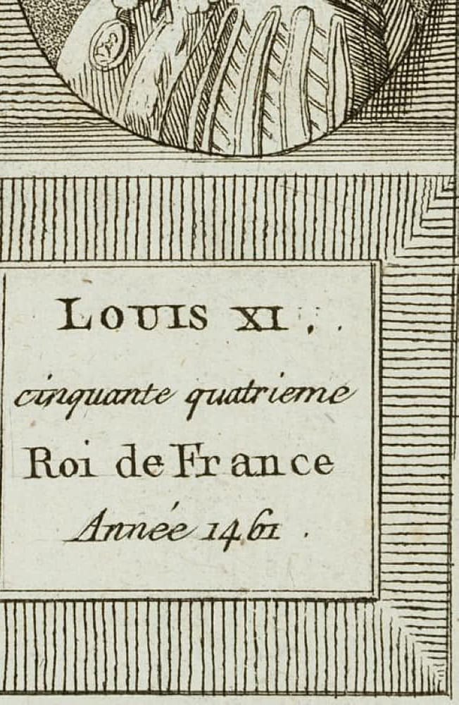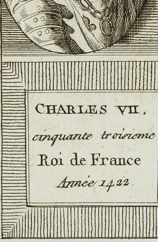 - Inscription: Links: „CHARLES VII. cinquante troisieme Roi de France Année 1422. Rechts: „Louis XI. fifty fourth King of France Year 1461.“
