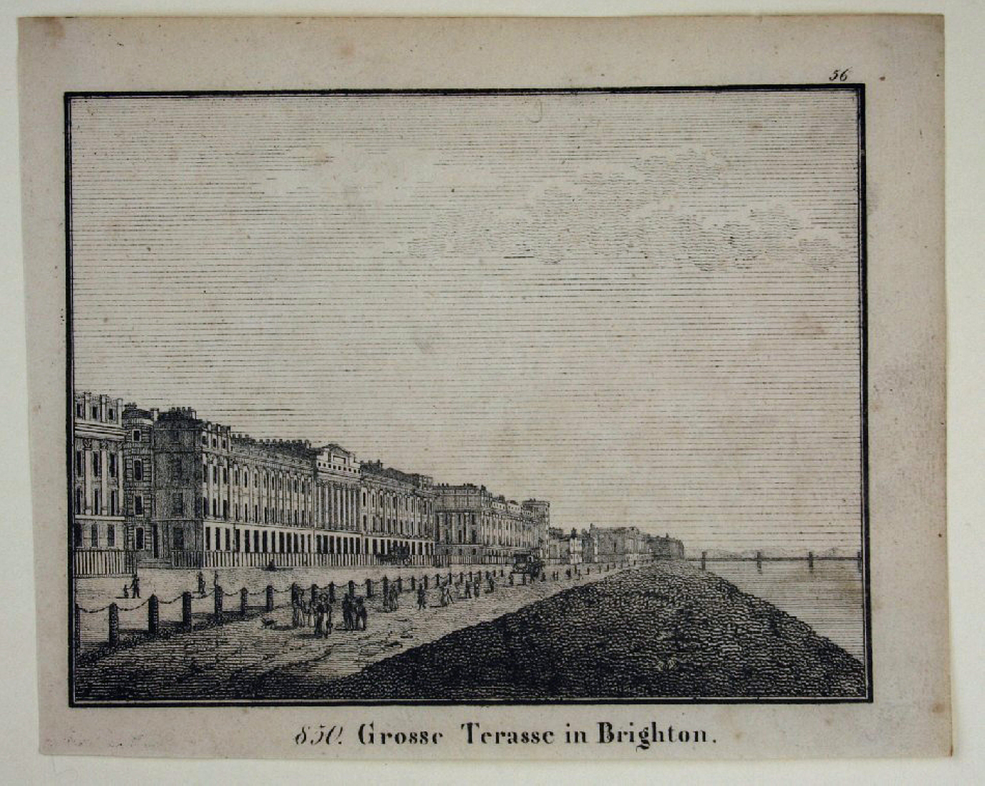 Unbekannter deutscher Künstler, Die große Terrasse in Brighton, Kupferstich, um 1830. Beschreibung:Kupferstich eines unbekannten Künstlers, nummeriert oben rechts: “56”, bezeichent unten: “850. Grosse Terasse in Brighton”. Sehr schön zieht sich die Reihe der prächtigen Häuser diagonal in die Bildtiefe. Auf dem breiten Weg Zwischen Häusern und Meer spazieren unzählige Menschen. Der Londoner Architekt Wild entwarf die Häuser der großen Terrasse, auch “Brunswick Terrace” genannt, in Brighton wie ein einziges, großes Gebäude (Baubeginn 1825). Es reihen sich hier 21 Privathäuser aneinander, denen korinthische Säulen in Kolossalordnung ein palastartiges Aussehen verleihen.