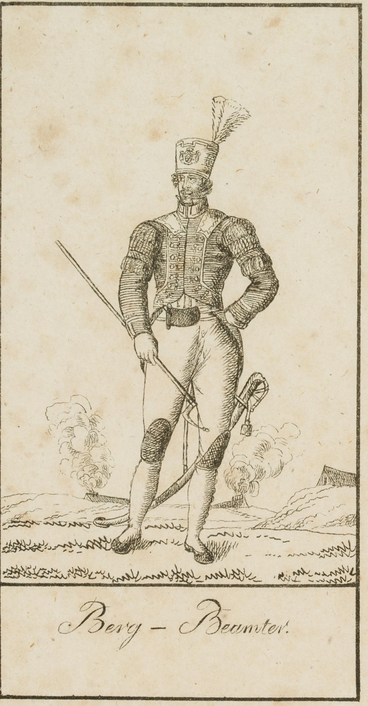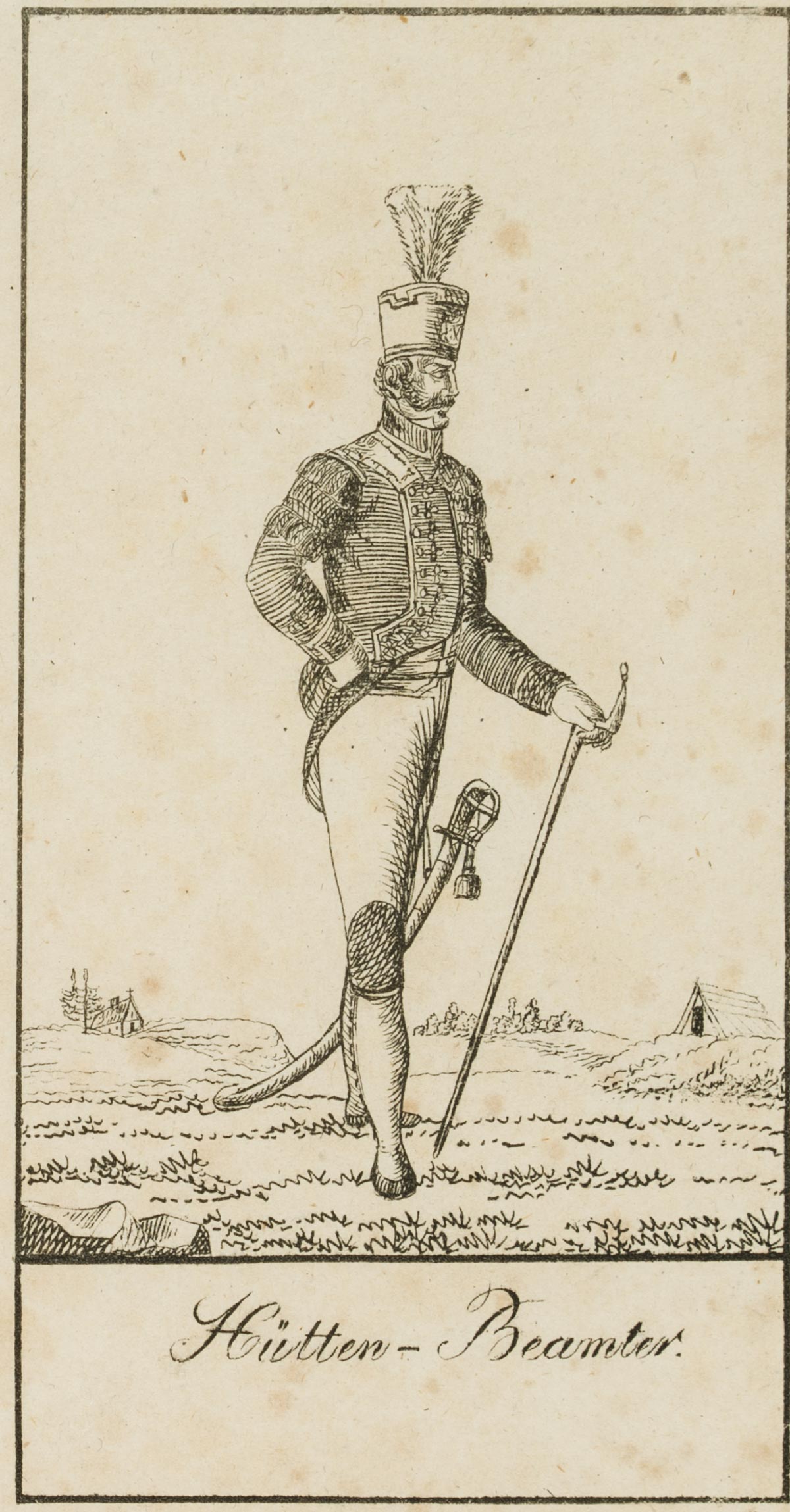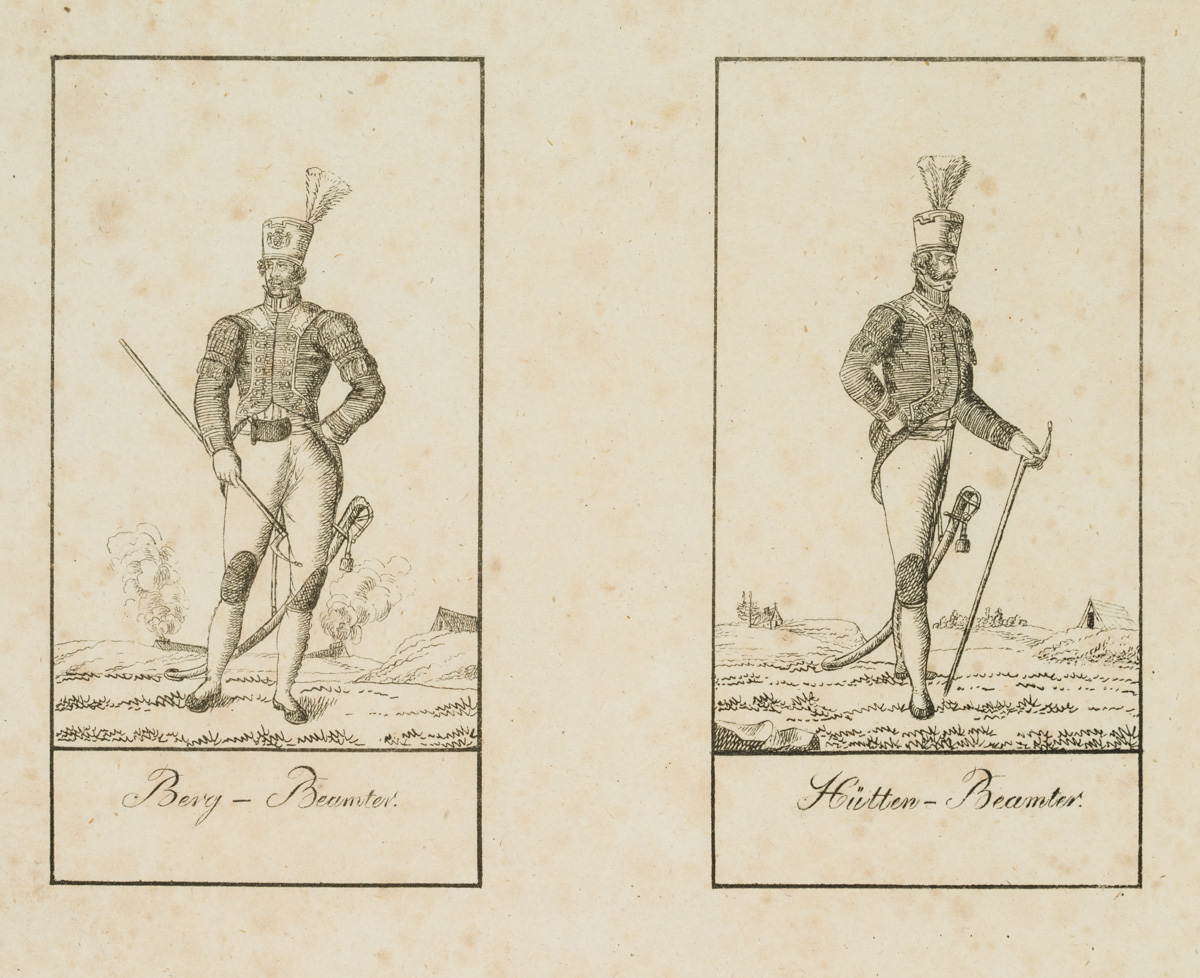 - Description: Two miners in their uniforms, designated as Bergbeamter and Hüttenbeamter. Bergbeamte were all officials employed by the mining industry, in a narrower sense the officials appointed by the state who were entrusted with the exercise of the rights and duties belonging to the state with regard to mining.