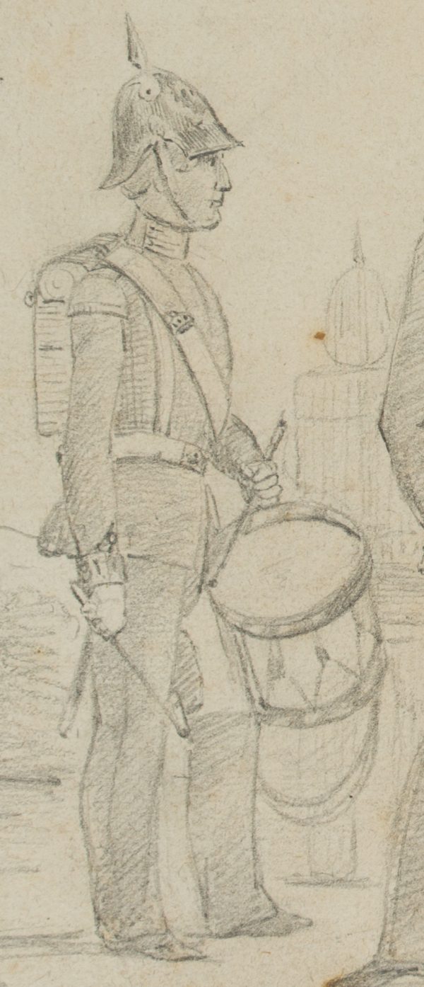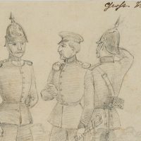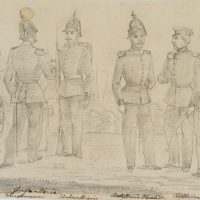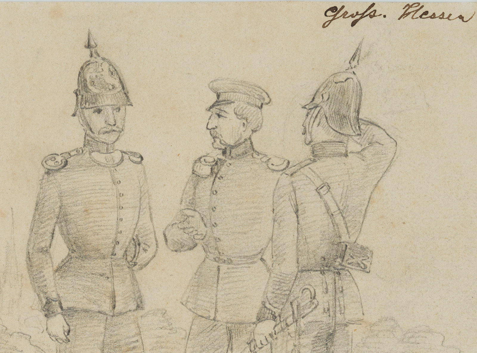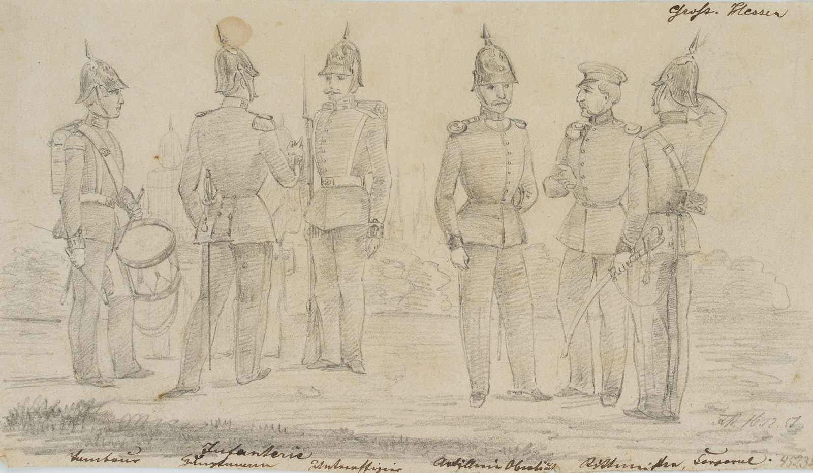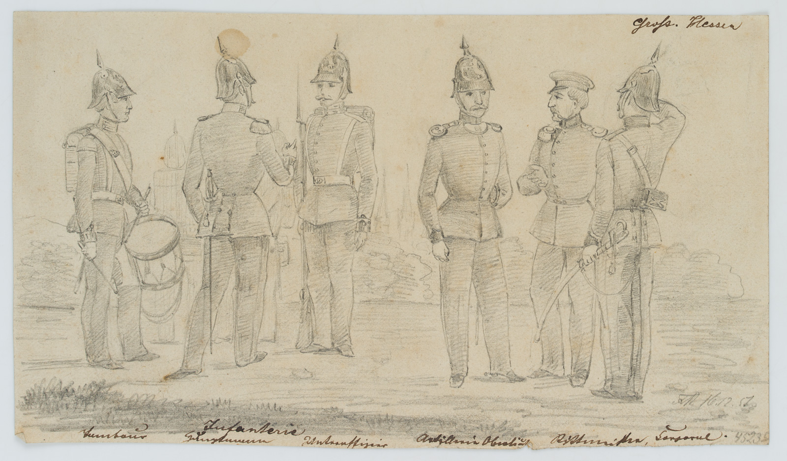 - Bezeichnung: Unten rechts datiert “16.12.’51”. In der rechten oberen Bildecke bezeichnet in brauner Tinte: “Großherz. Hessen” und am unteren Bildrand: “Tambour / Infanterie / Artillerie / Rittermeister / Leutnant”.