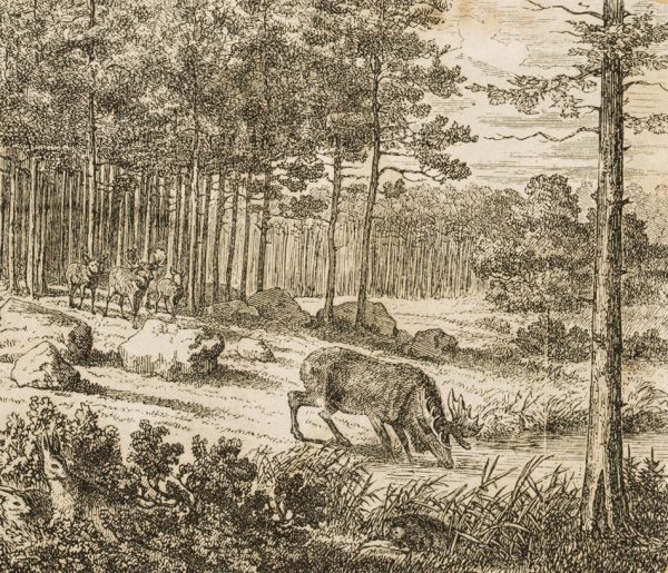Unbekannt (19. Jahrhundert), Elche am Fluss, 19. Jahrhundert, Holzschnitt