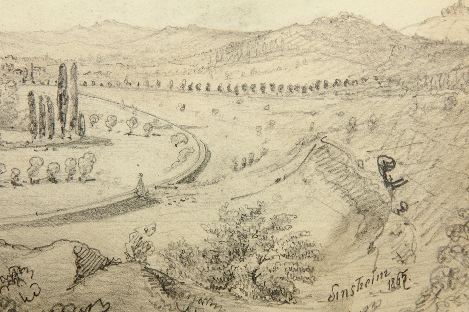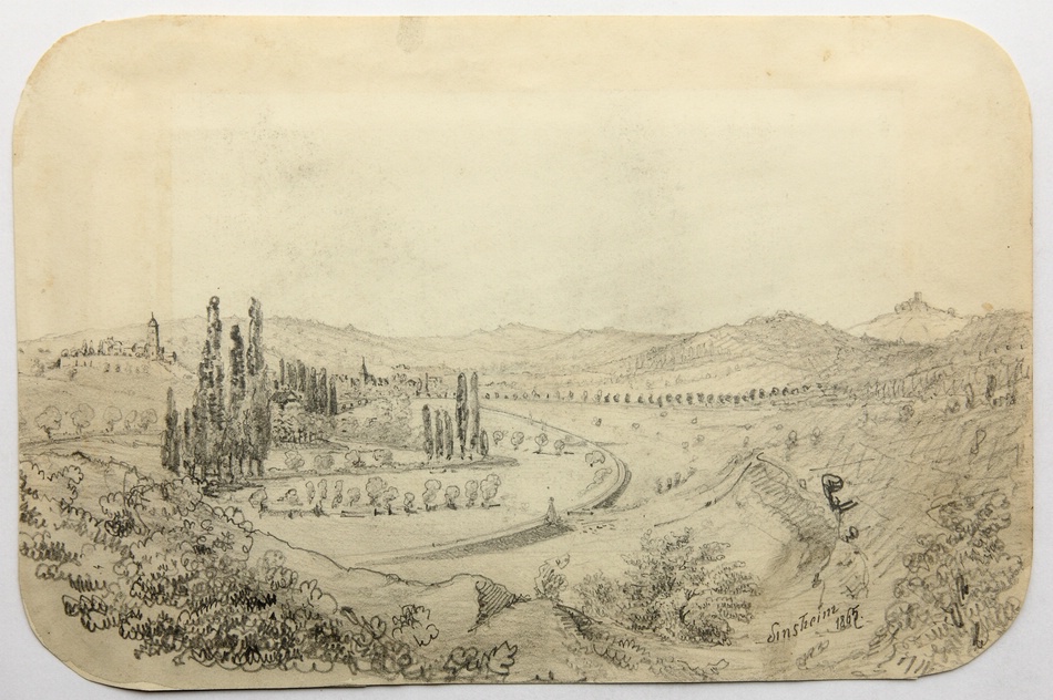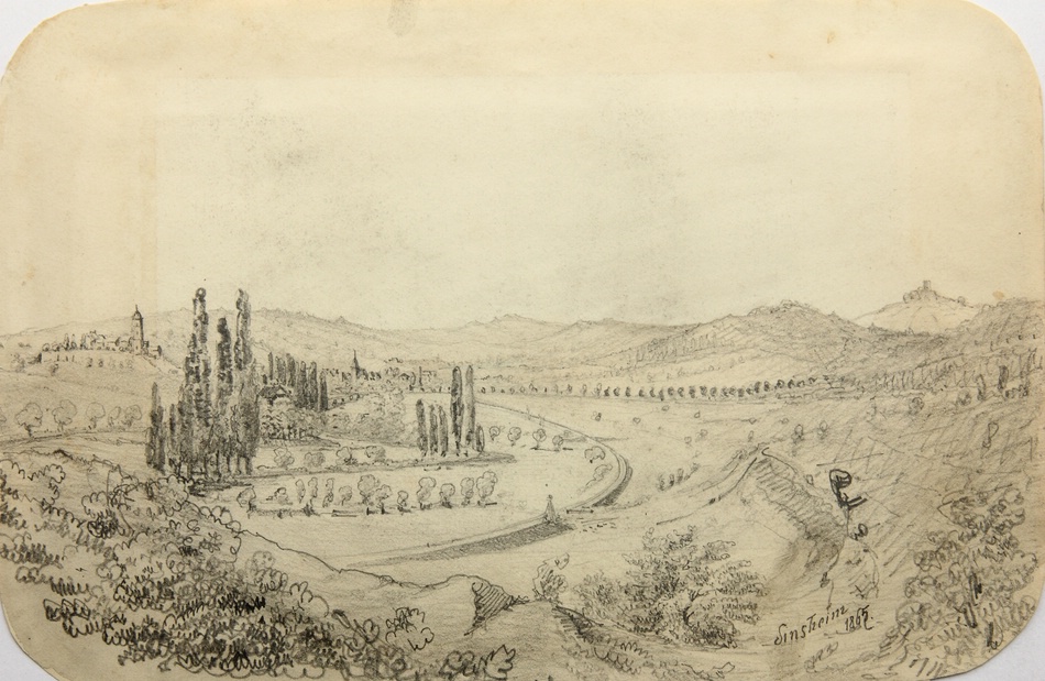 Unbekannt (19. Jahrhundert), Elsenztal zu Sinsheim und Burg Steinsberg, 1865, Bleistift