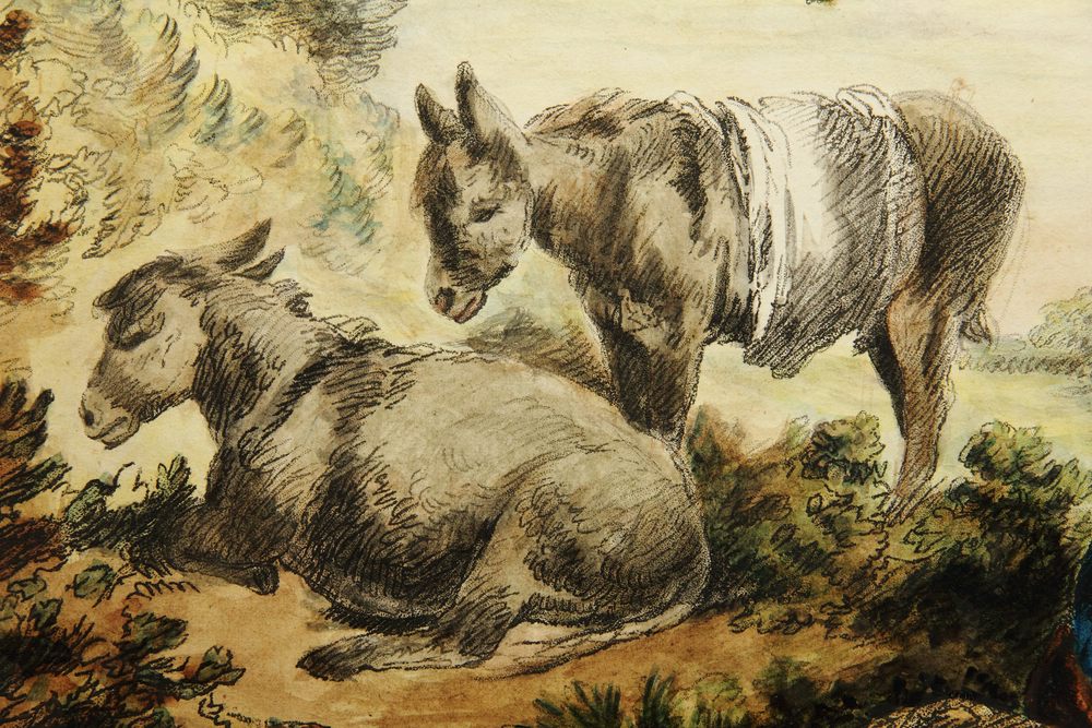 - Beschreibung: Lagersezene einer reisenden Familie mit zwei Eseln. Vater und Mutter kümmern sich jeweils um ein Kleinkind, während der älteste Sohn auf einen Baum klettert. Schöne Naturdarstellung mit kräftigen Farben.