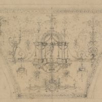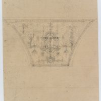 - Beschreibung: Entwurfszeichnung für die Dekoration einerechts Gewölbekappe. Architektonischerechts Rahmen mit Bildfelder, in dem Figuren und Arabesken skizziert sind. Neben der Darstellung einzelne Skizzen sowie Konstruktionslinien.