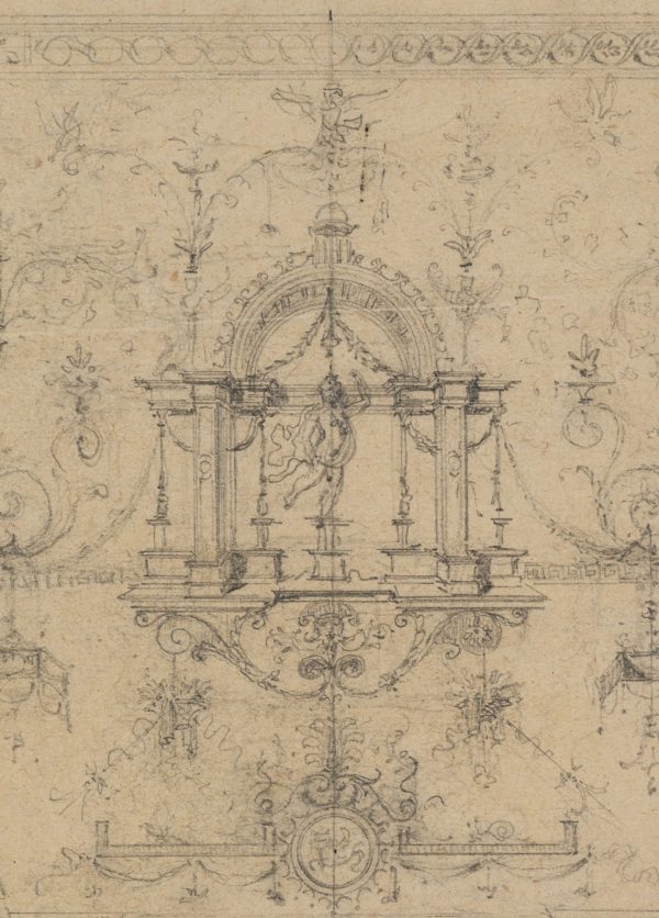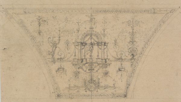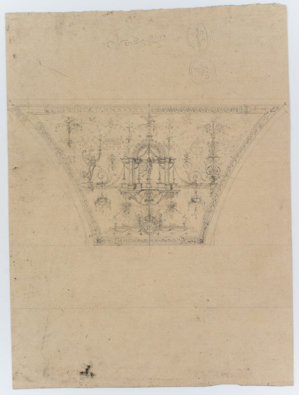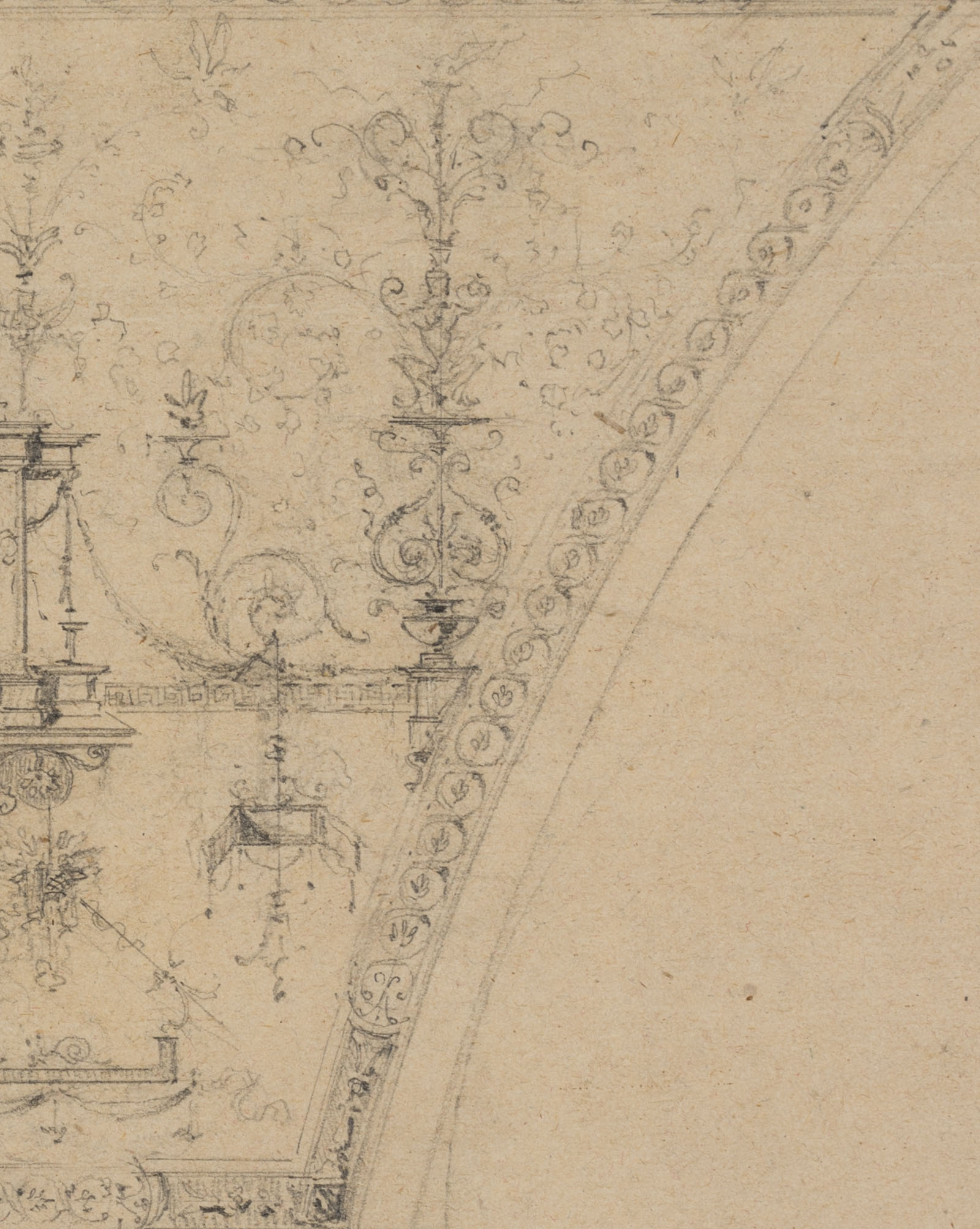 - Description: Design drawing for the decoration of a right vaulting cap. Architectural right frame with picture fields, in which figures and arabesques are sketched. Beside the depiction individual sketches as well as construction lines.