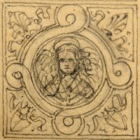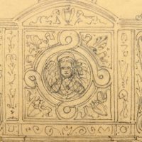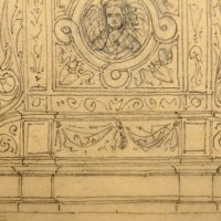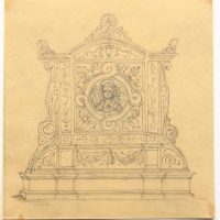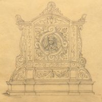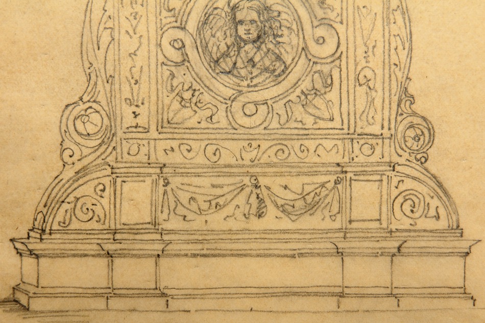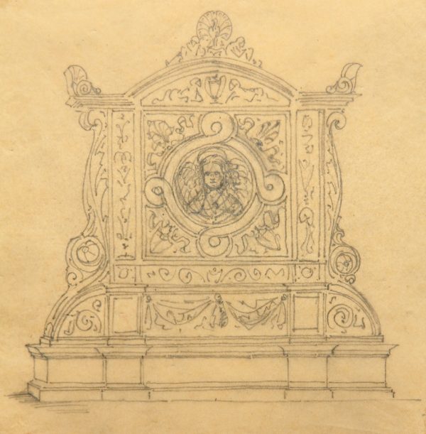 - Beschreibung: Anonyme Entwurfszeichnung für ein Grabepitaph oder ähnliches in neurenaissancezeitlichen Formen. Mittig ist schemenhaft ein Engel zu sehen, während auf der Spitze ein Pfau mit geschlagenem Federrad steht.
