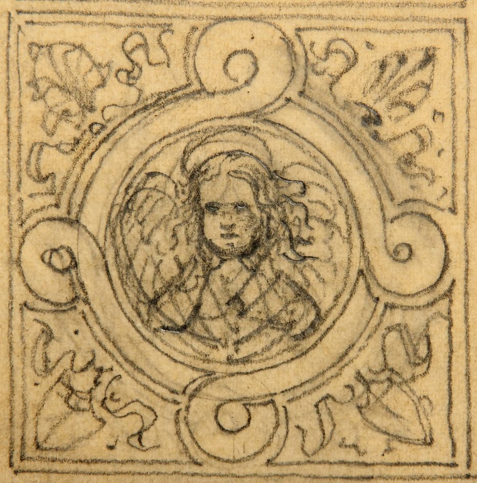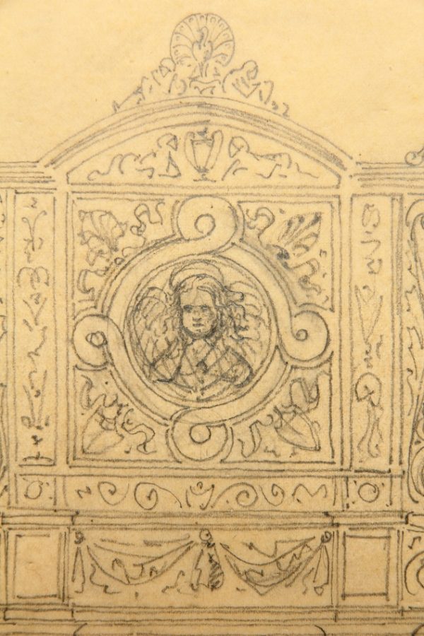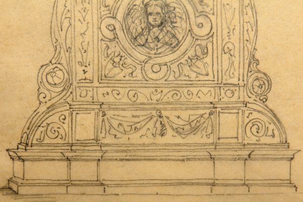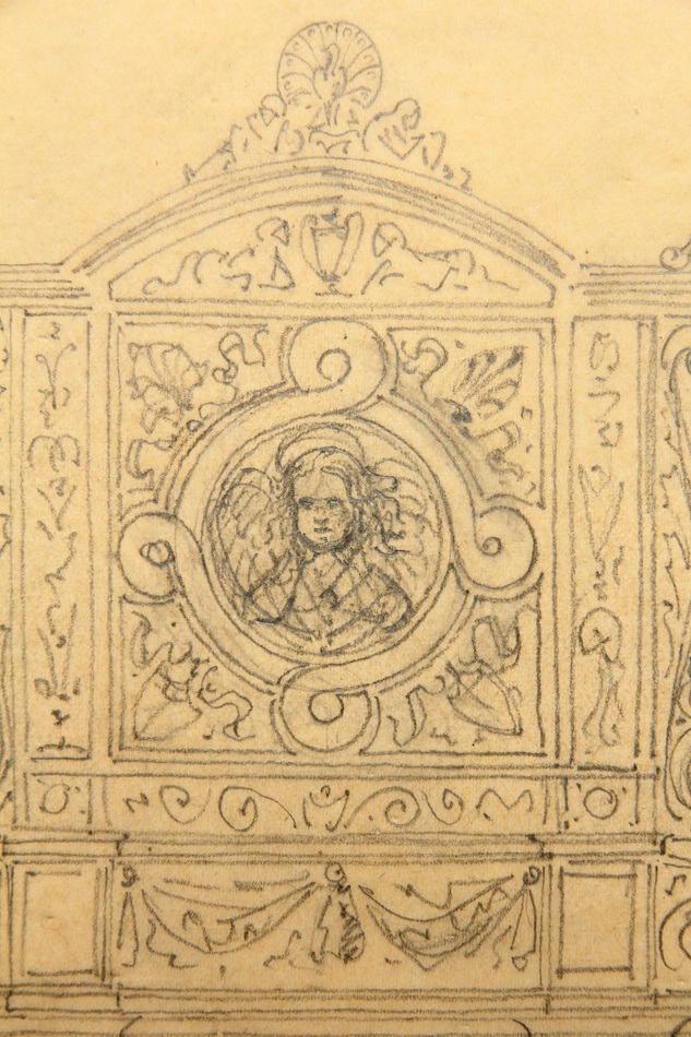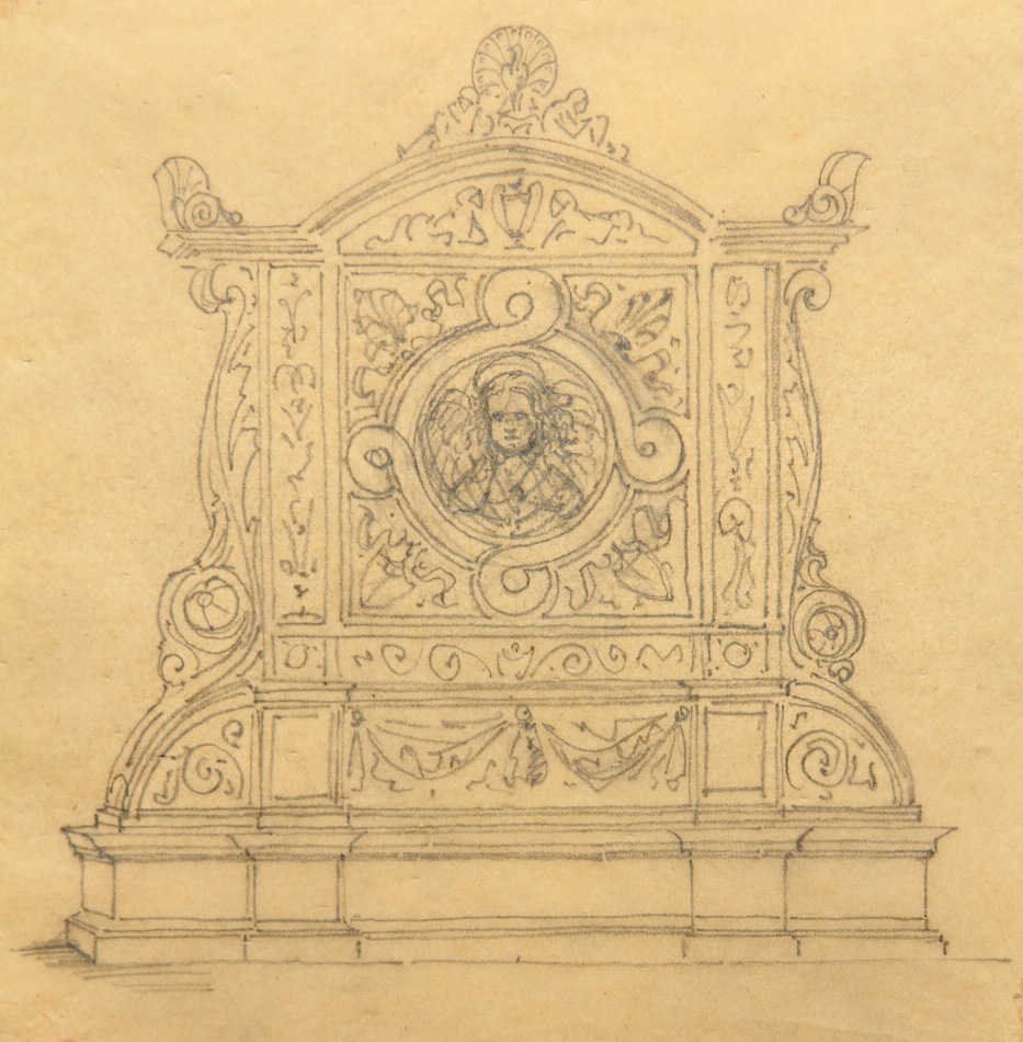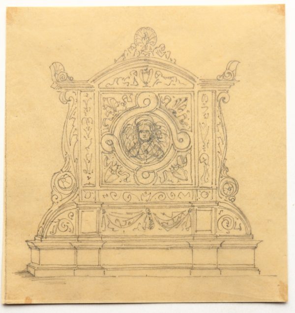 - Description: Anonymous design drawing for a funerary epitaph or similar in neo-Renaissance forms. An angel can be seen in the centre, while a peacock with a beaten feather wheel stands on the top.